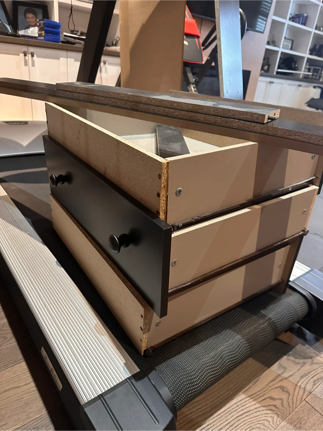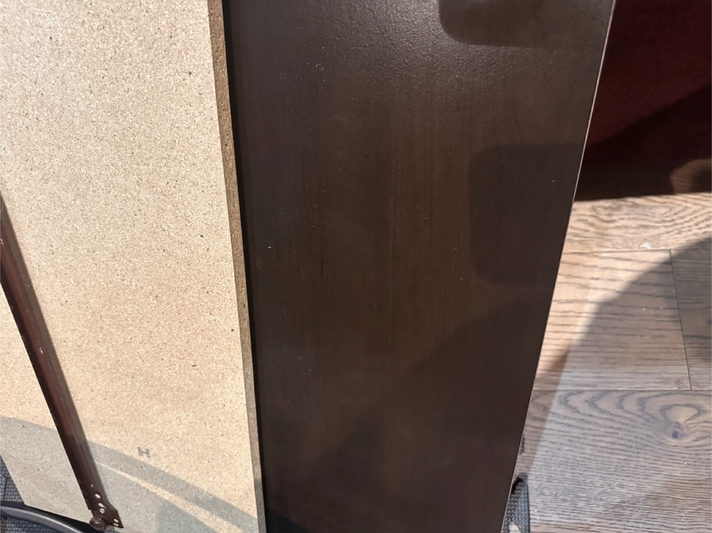 It is currently taken apart and the first picture is for reference only. Dark brown color. Has a few scrapes around screw areas.