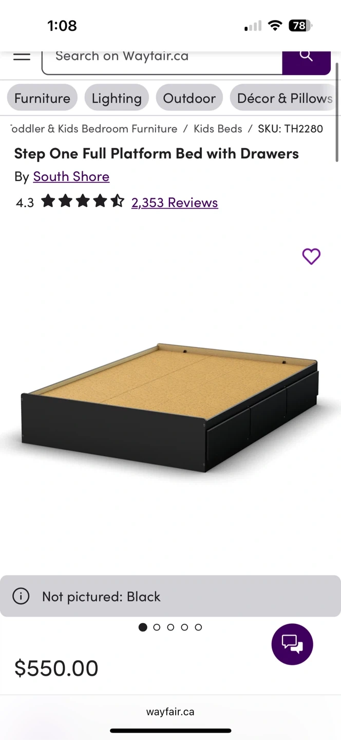 Selling a full (double) platform bed with drawers. The bed frame is black and includes drawers for storage. Retails for $550.00