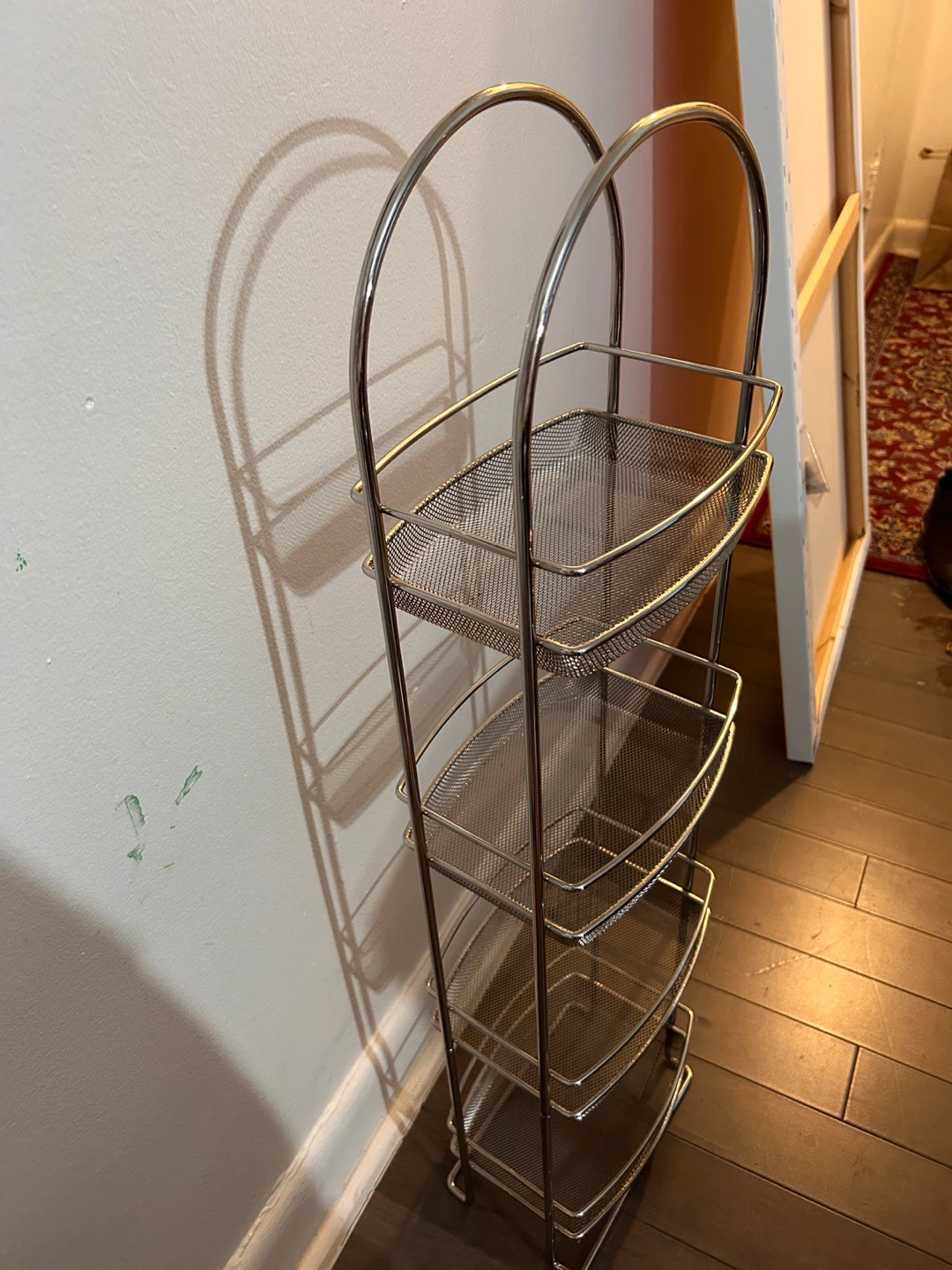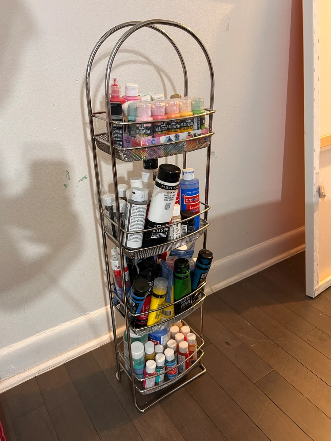 Here's a handy silver metal rolling cart with four tiers! It's great for storing art supplies, toiletries, or anything else you need to keep organized. It's in good condition and ready to roll into your space