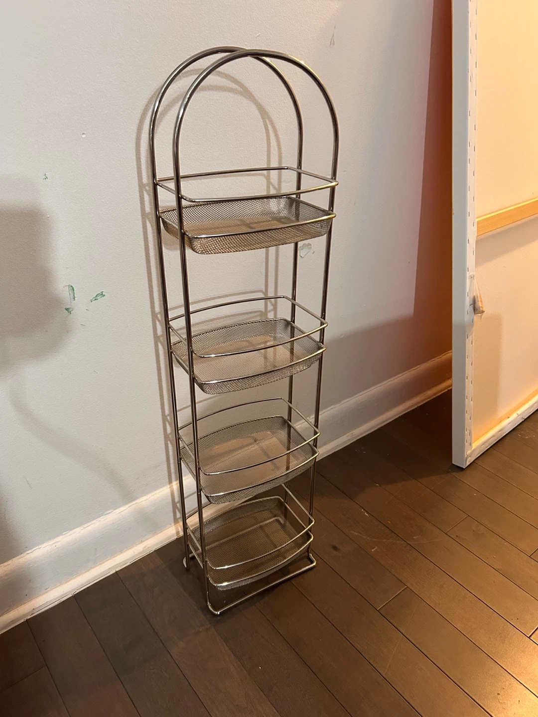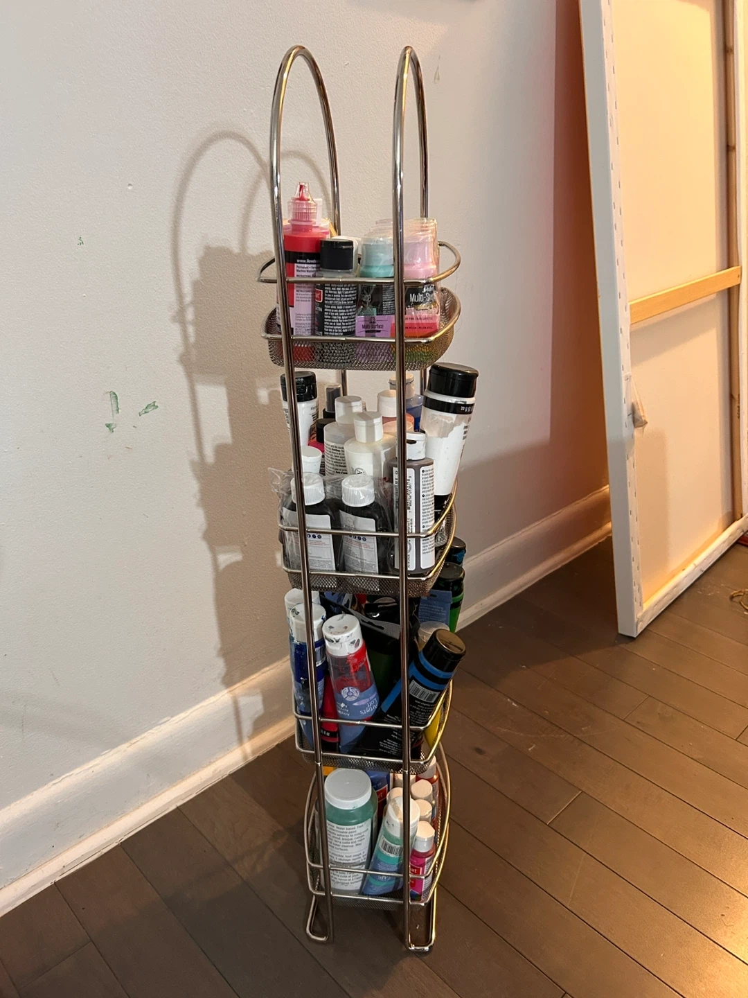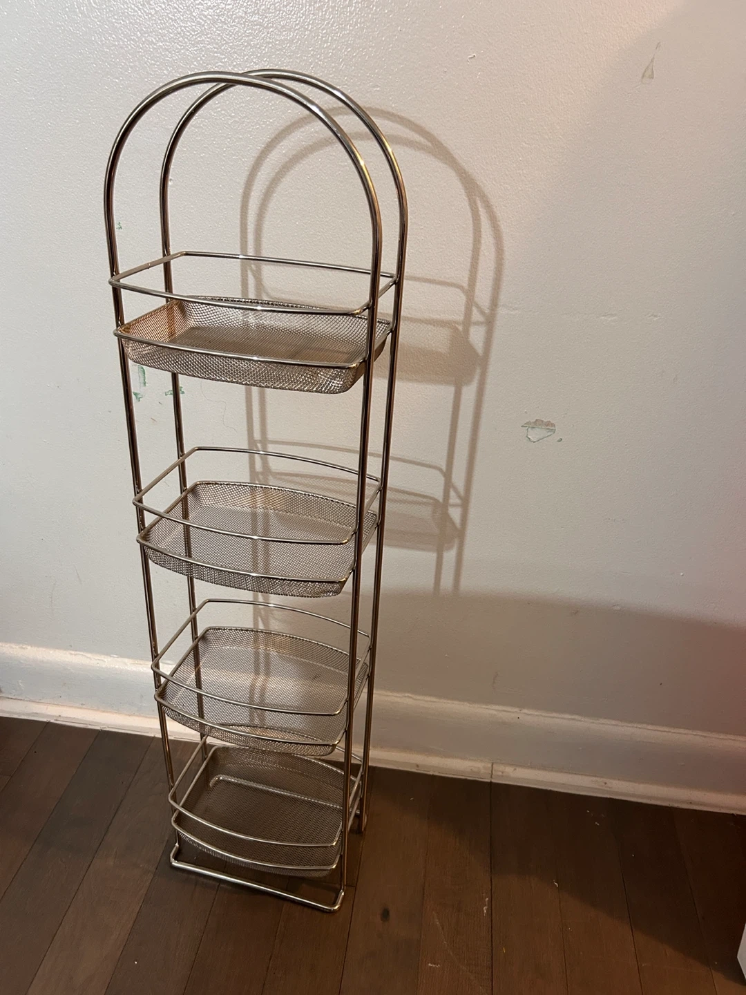 Here's a handy silver metal rolling cart with four tiers! It's great for storing art supplies, toiletries, or anything else you need to keep organized. It's in good condition and ready to roll into your space