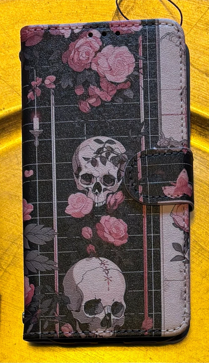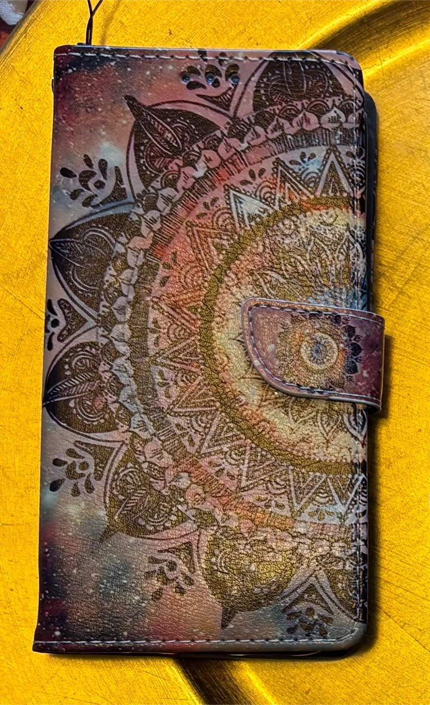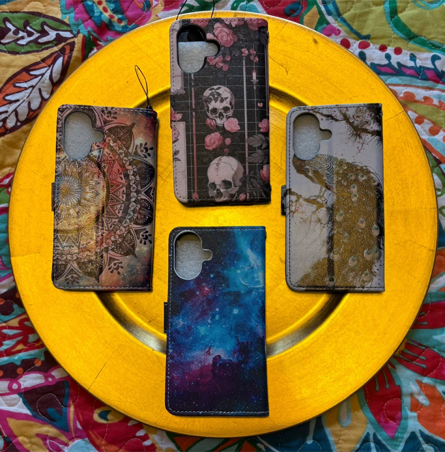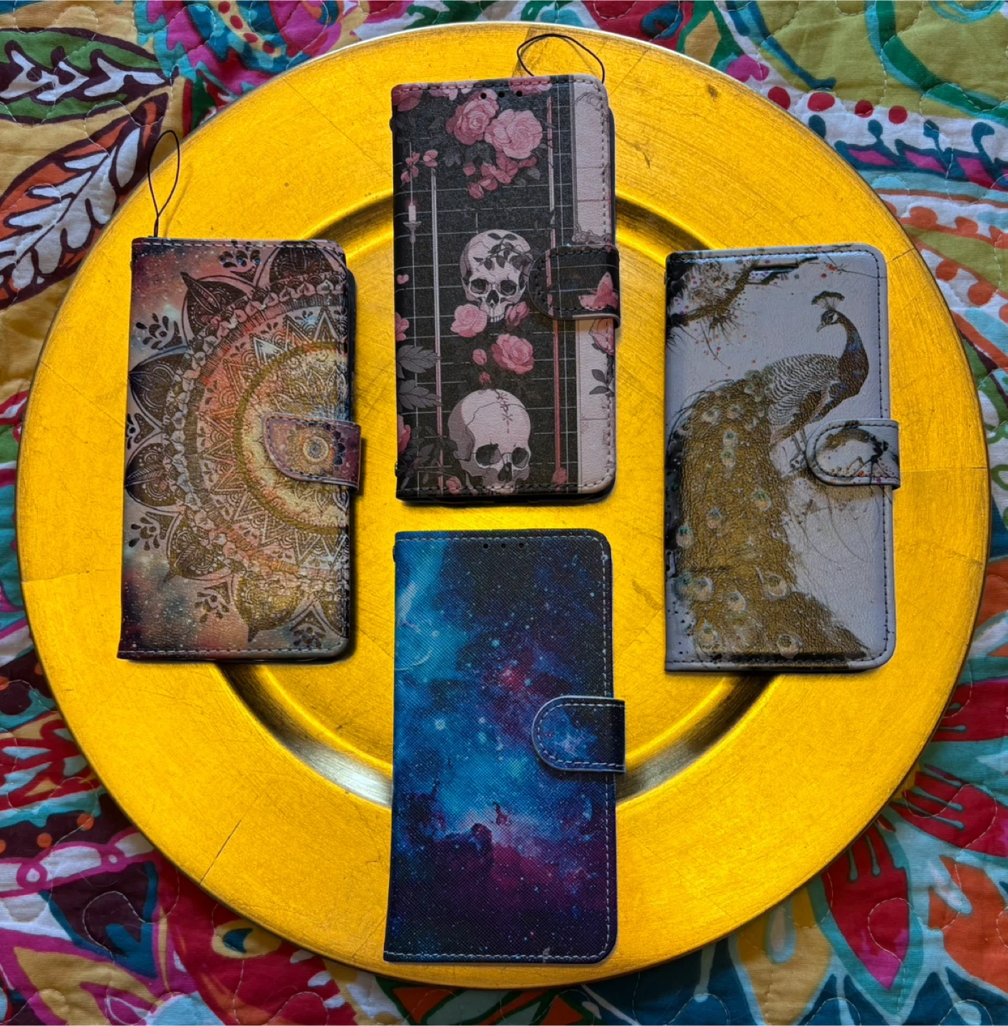 Selling these assorted phone cases! They have different designs, including galaxy, skull with roses, mandala, and peacock. They're in perfect condition and ready for a new phone 😊 $15 each