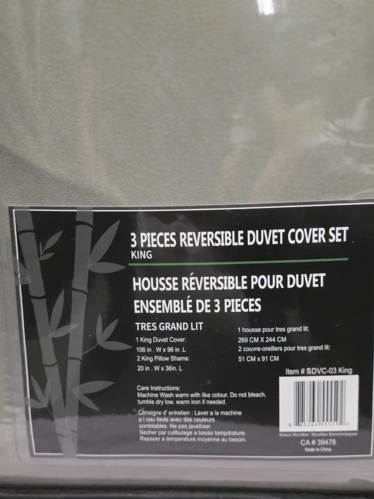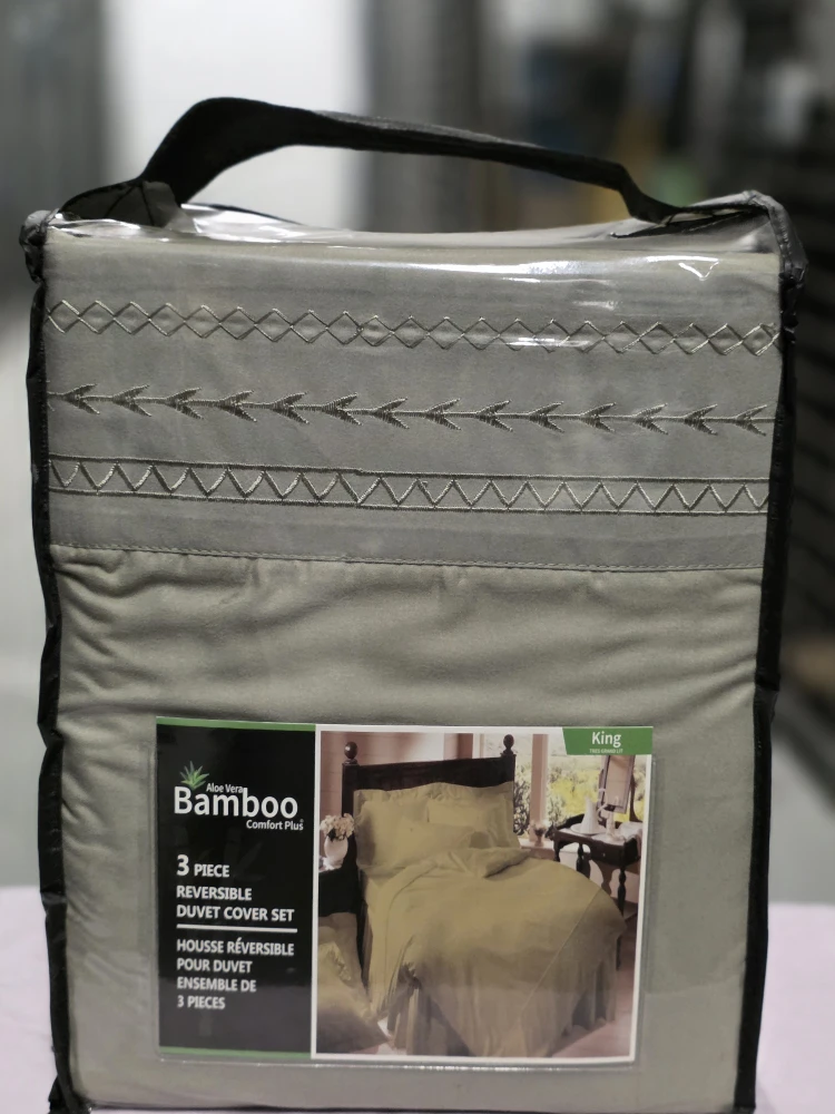 Selling a brand new, still-in-packaging Bamboo Comfort Plus 3-piece reversible duvet cover set in King size. Includes one duvet cover (106 in x 96 in) and two pillow shams (20 in x 36 in). The duvet cover measures 269 cm x 244 cm, and the pillow shams are 51 cm x 91 cm