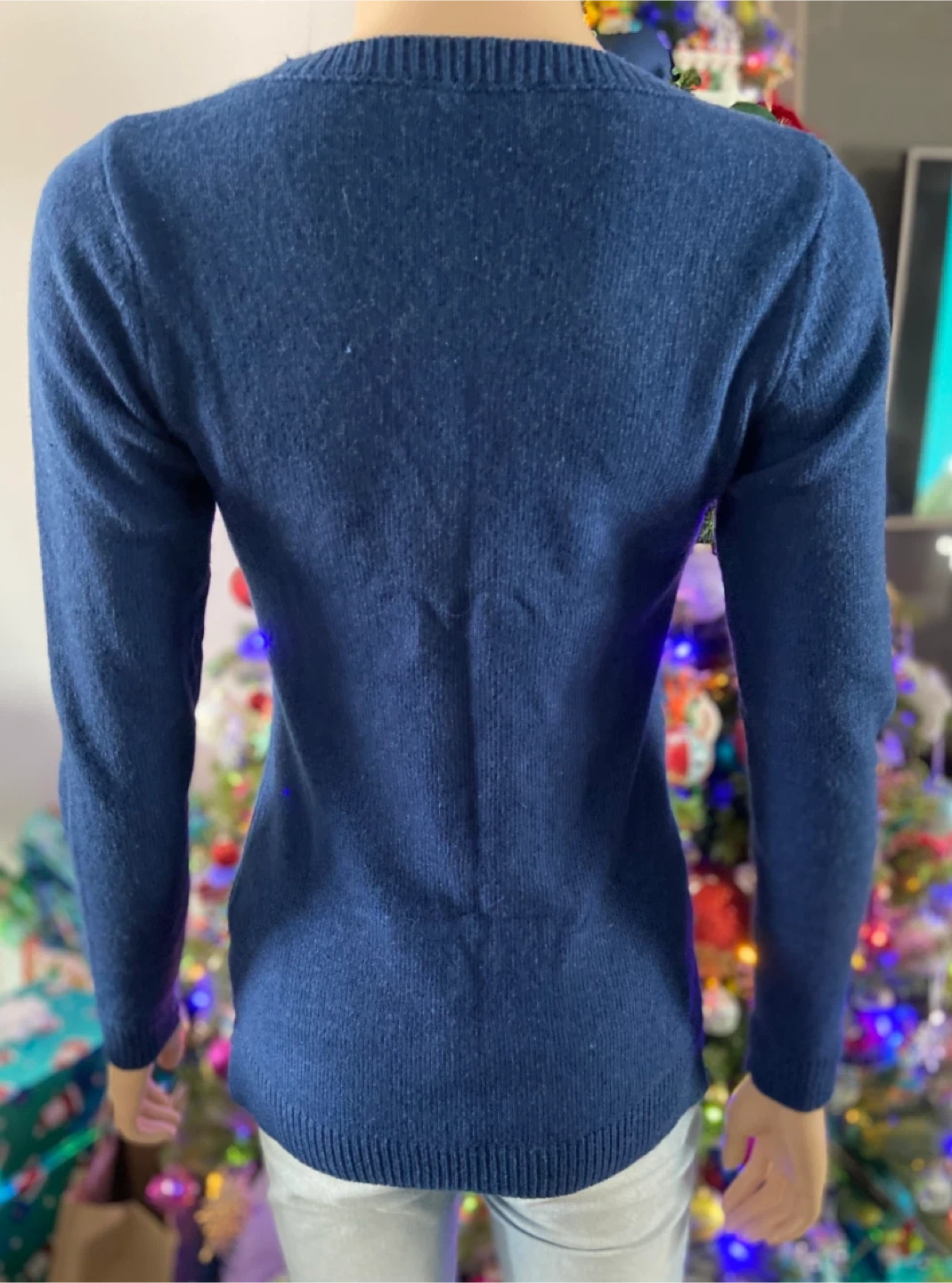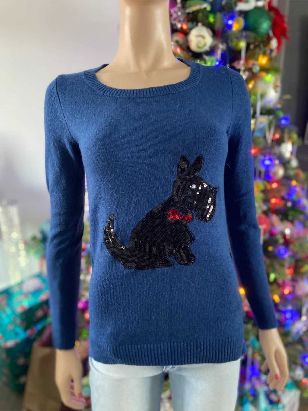 A cute blue Ricki’s sweater with a Scottie dog design made of sequins. It's in excellent condition, only worn once and smk-free. Perfect for the Christmas holiday season! Size XS. Pick up north end St Catharines