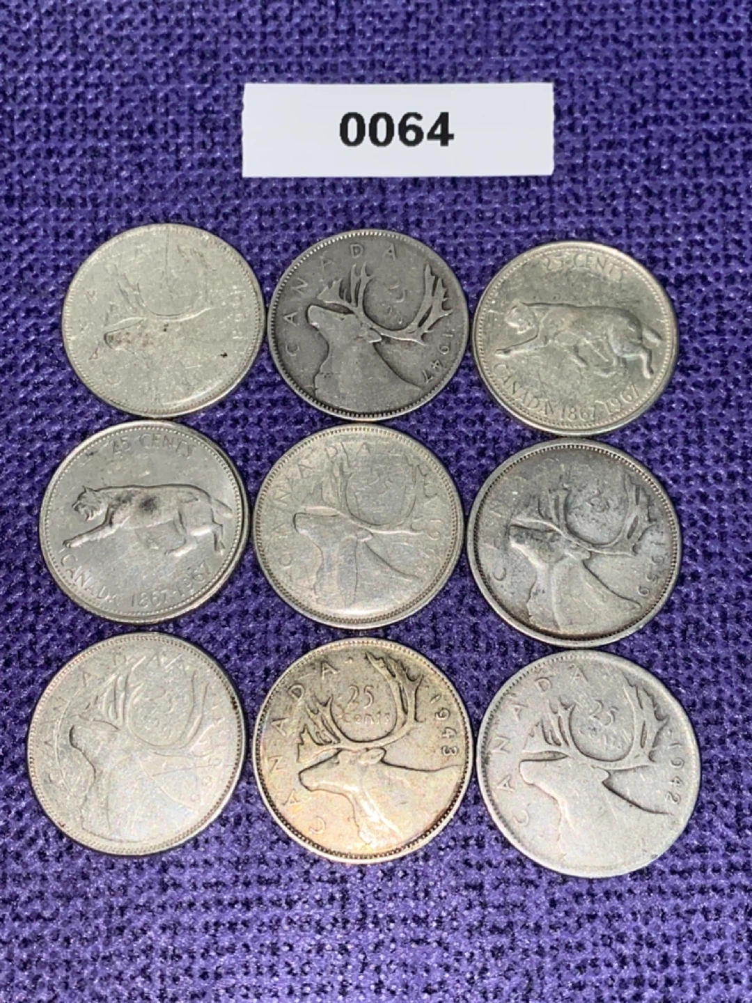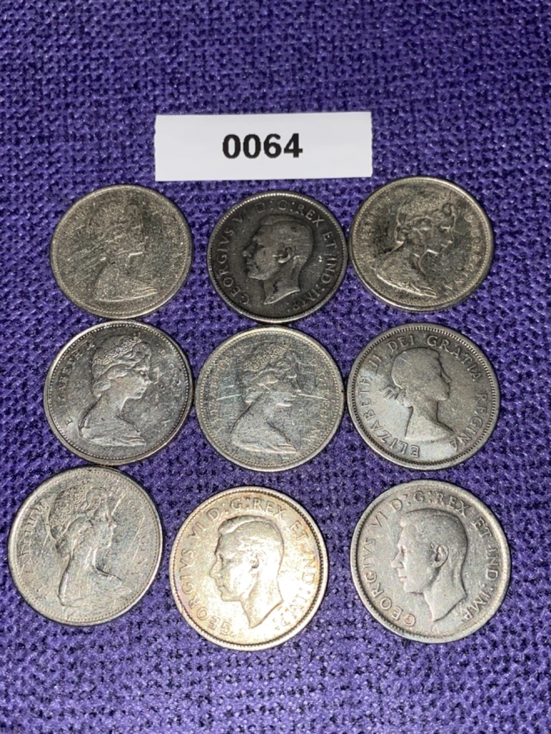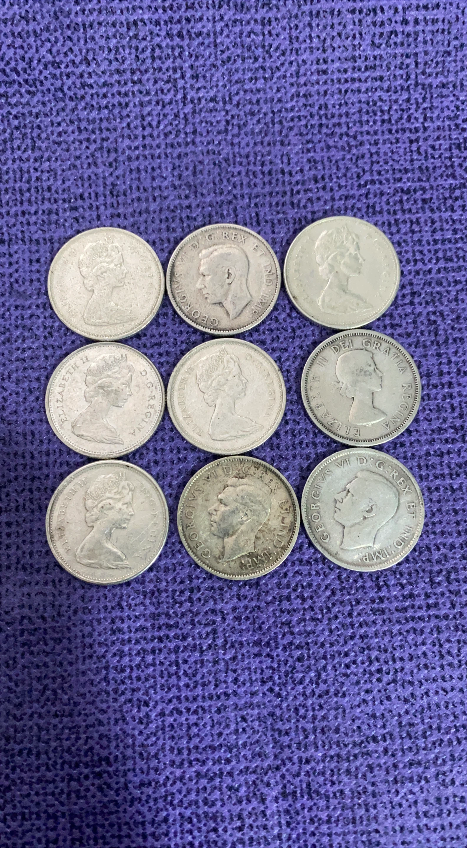 Selling a collection of vintage Canadian coins featuring Elizabeth and George. These coins have some wear from age, but they are still in good condition for collectors