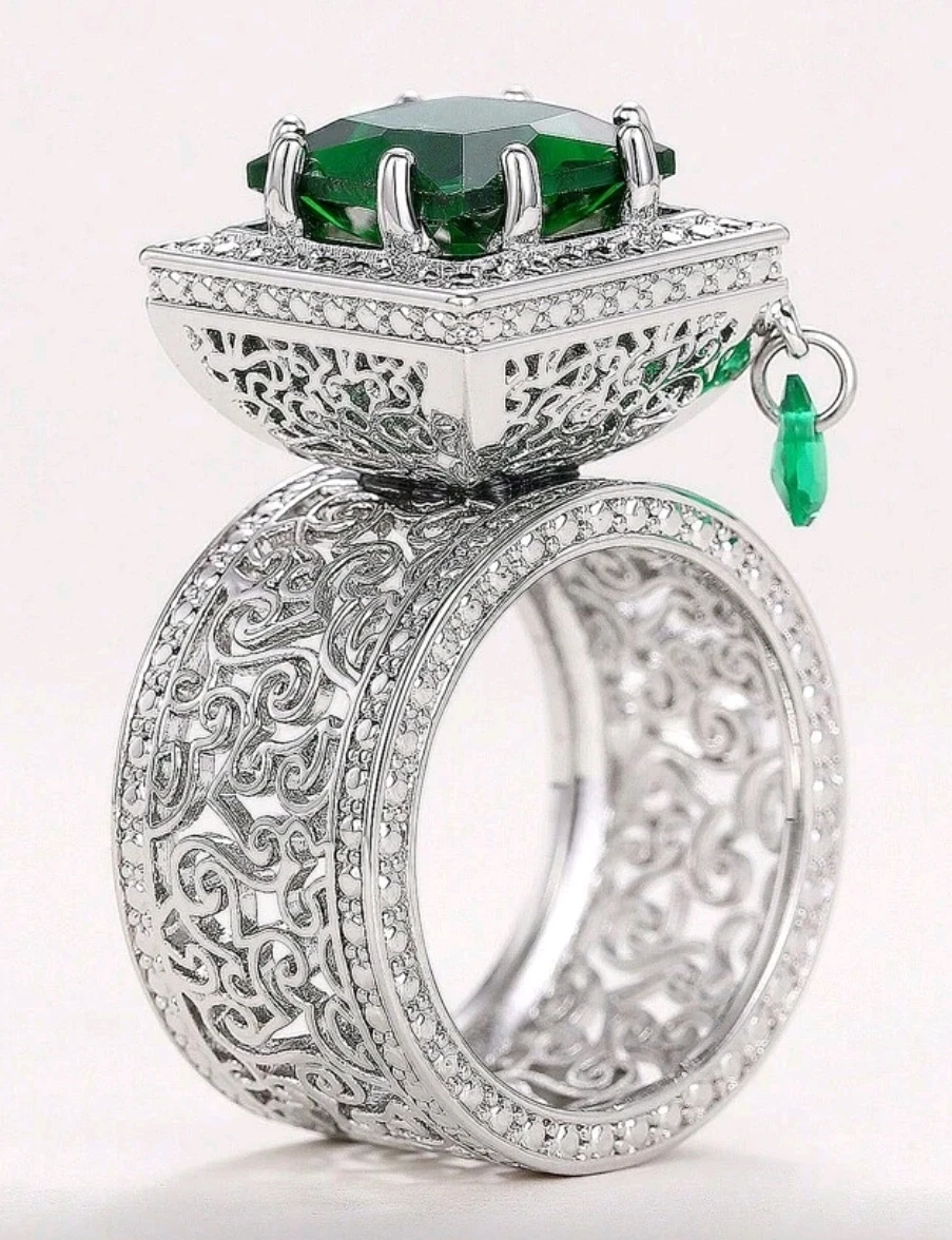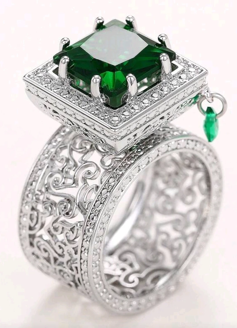 Beautiful emerald and silver ring, perfect for adding a touch of elegance to any outfit! It features a detailed silver band and a striking emerald stone.