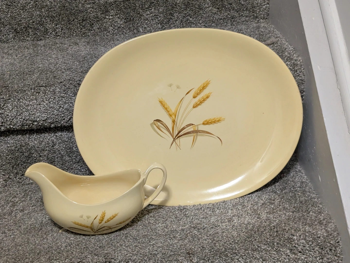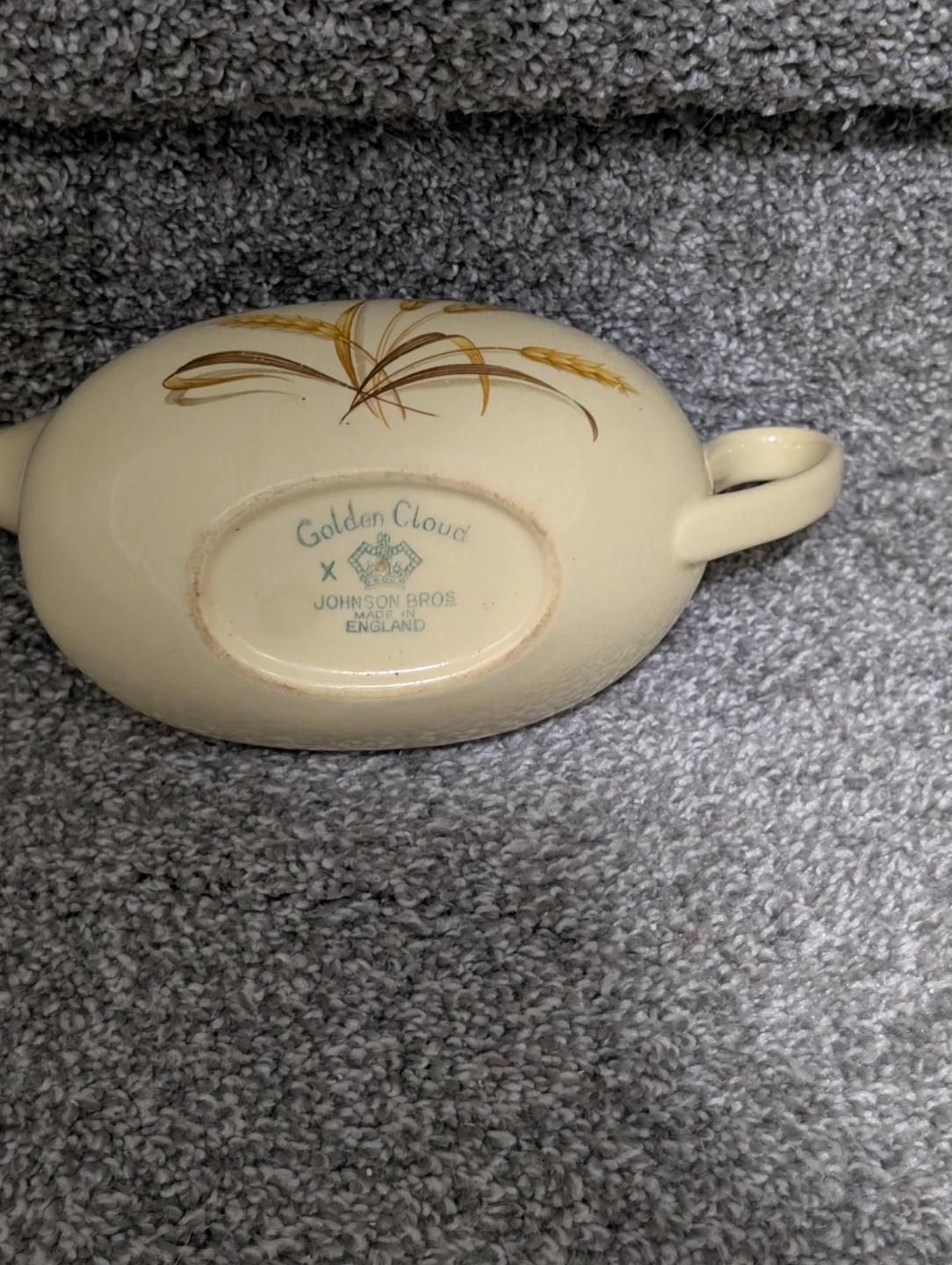 Selling a Johnson Bros Golden Cloud gravy boat and platter set. The set features a wheat design on a cream-coloured background. Perfect for adding a touch of vintage charm to your table!