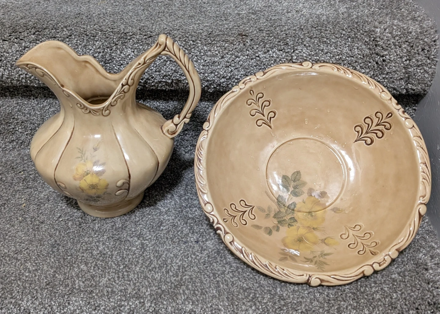 Selling a lovely vintage pitcher and bowl set! It features a beautiful floral design and a unique, decorative handle on the pitcher. Perfect for adding a touch of classic charm to your home decor