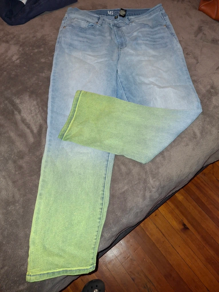 Selling a pair of D2 jeans in size 10. They are made of 76% cotton, 23% polyester, and 1% spandex. The jeans have a unique color gradient, fading into green at the bottom.