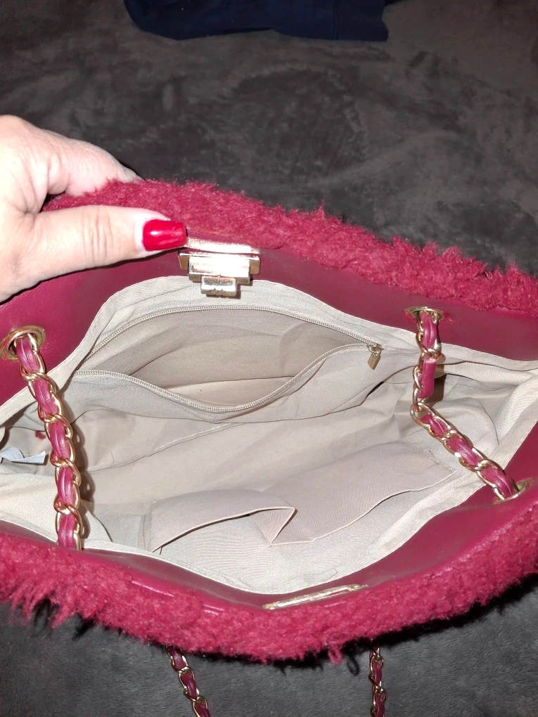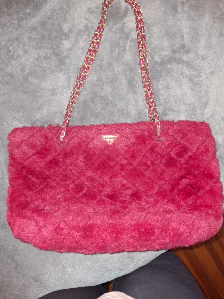 This is a stylish pink fuzzy shoulder bag with a gold chain strap. It's perfect for adding a fun and unique touch to any outfit. The bag has a spacious interior and is in great condition!