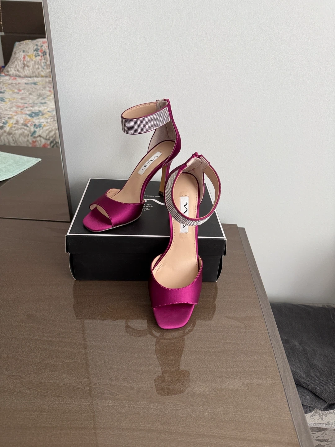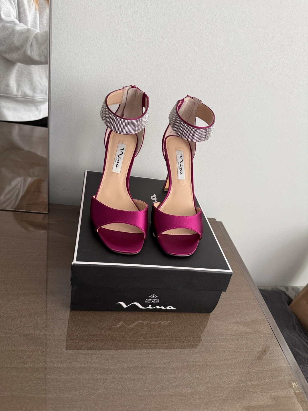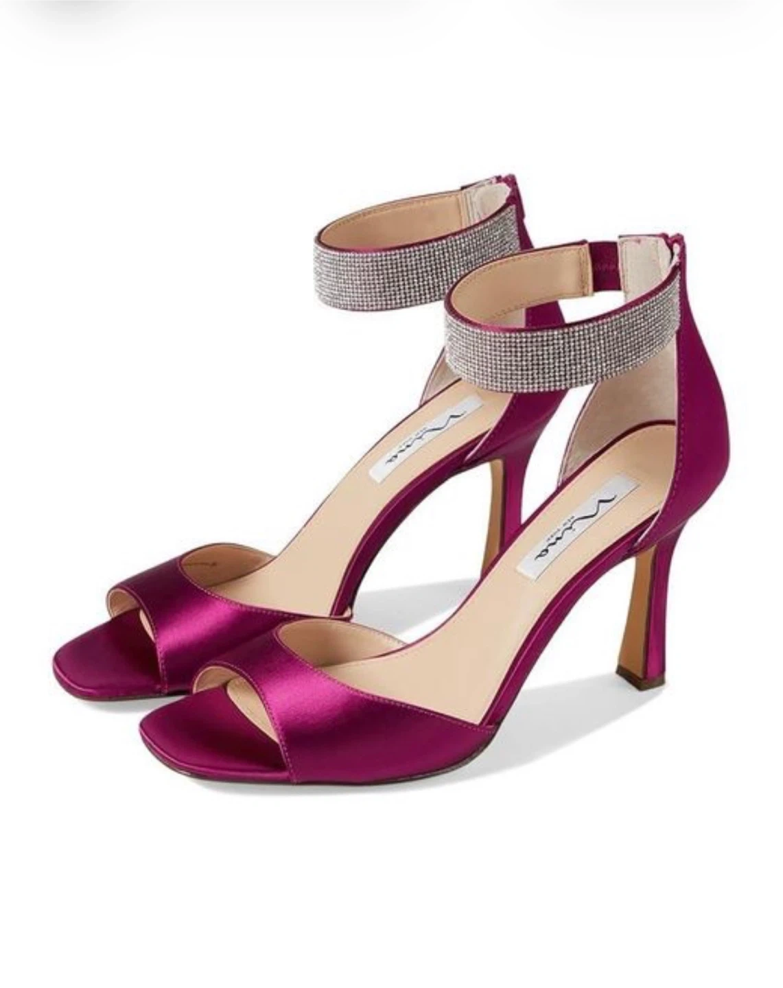 Selling a pair of Nina Dezzie-YS heels in a beautiful wine crystal satin colour. They are a size 7M. The shoes come with their original box!