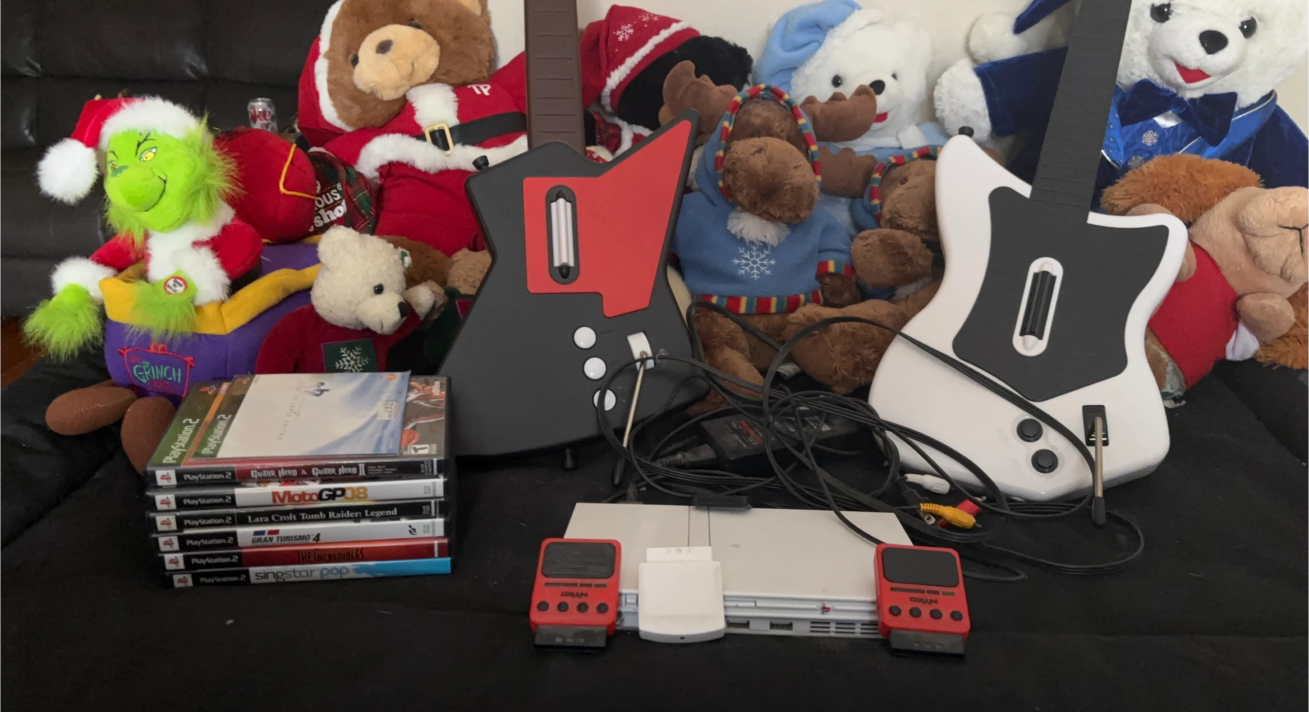 Selling a PlayStation 2 console and controller with a bunch of games, including Guitar Hero and Guitar Hero II! Also included are two Guitar Hero guitars, one black and one white. Perfect for some retro gaming fun! 100 firm thank you