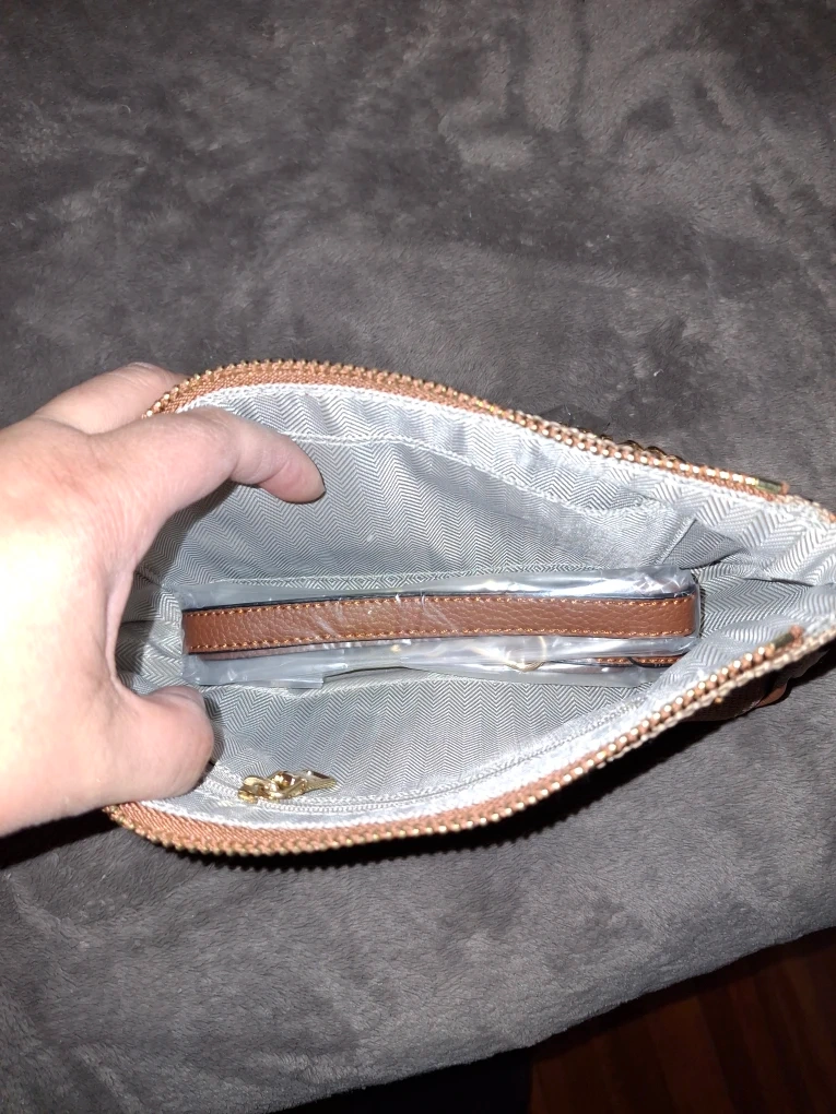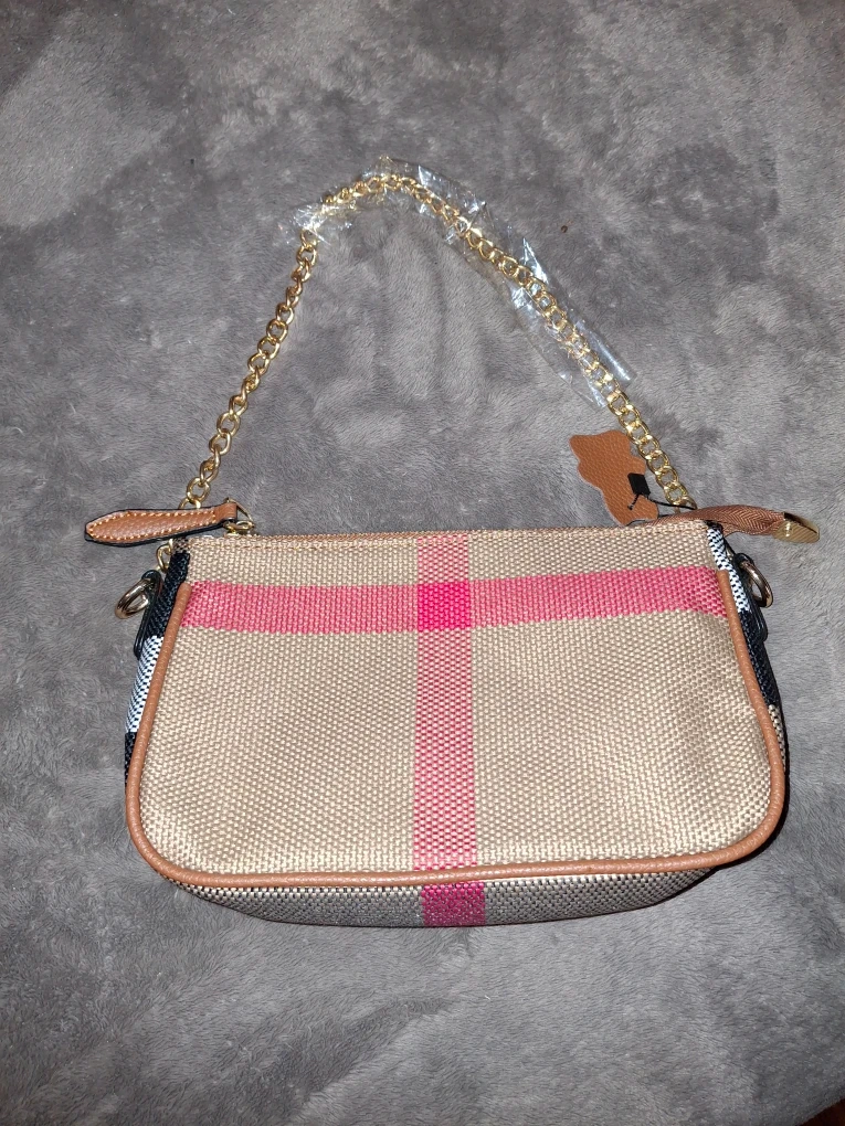 This is a cute plaid crossbody bag with a gold chain strap. It's perfect for carrying your essentials when you're on the go. The bag is in great condition and ready for a new owner!