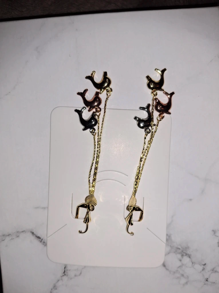 These are a pair of dangling earrings featuring a unique design. Each earring has three small whale figures in different colors (gold, copper, and black) stacked on top of each other, connected by a delicate gold-colored chain to a small umbrella charm at the bottom. They are perfect for adding a touch of whimsy to any outfit!
