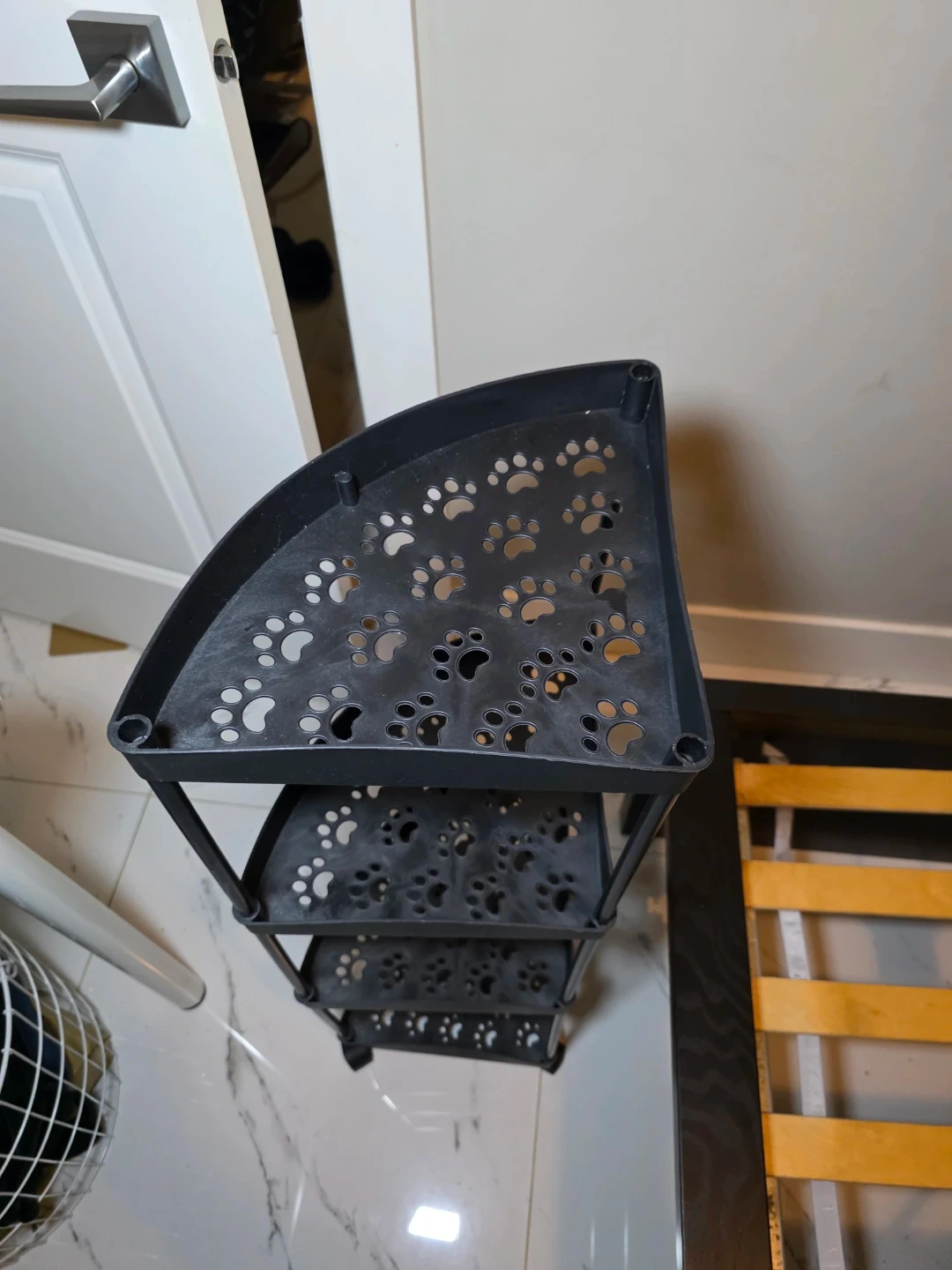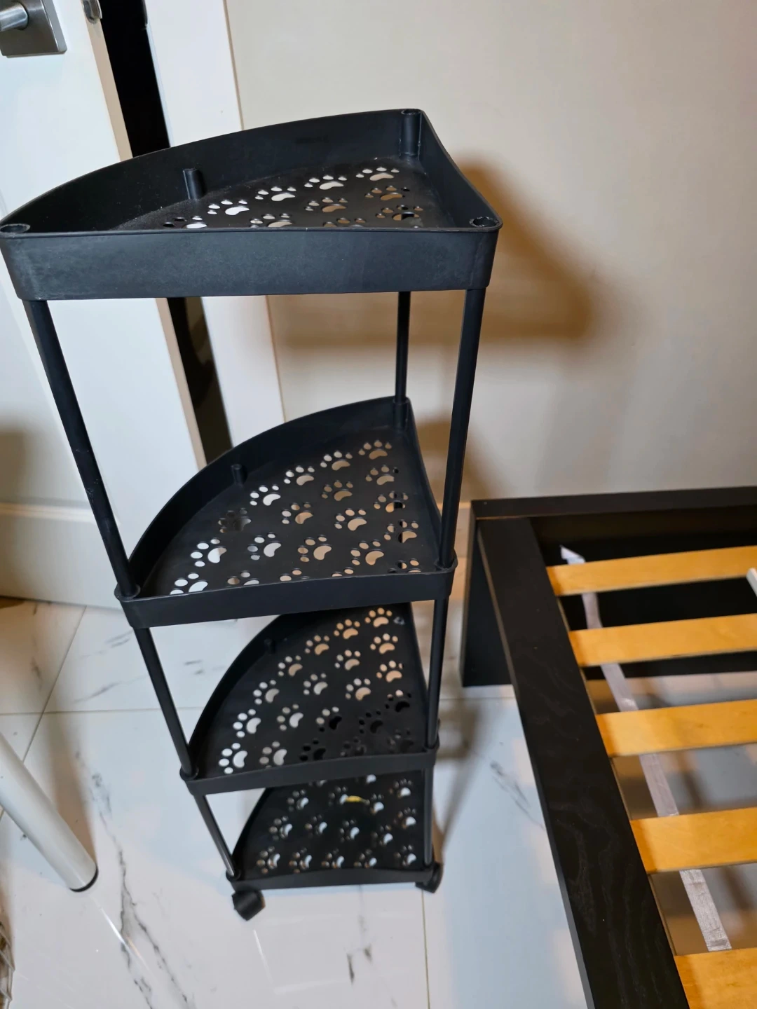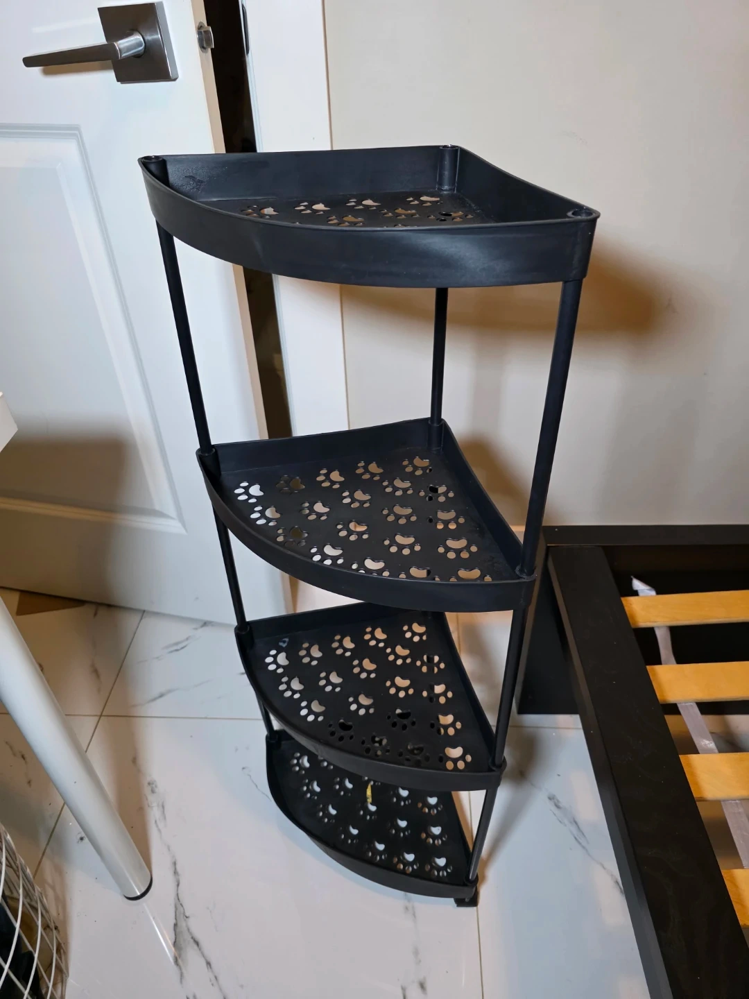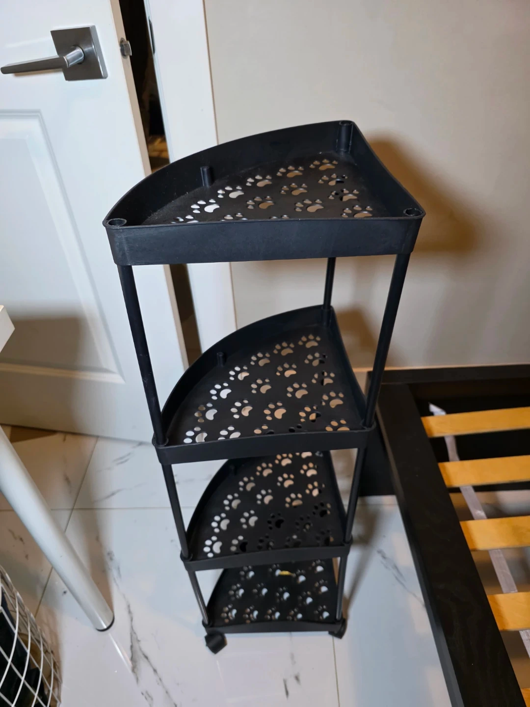 This is a black corner shelf with a cute paw print design on each tier. It's perfect for adding some storage to a small space while adding a touch of fun!