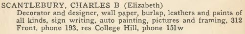 Charles first showed up in the 1899 Farmers and Business Directory, as the Wallpaper King of Belleveille, ON. The 1909 Vernon Guide shows that by then he had added stationery and books to his business and was located at 360 Front St. Belleville, ON. The 1913 Vernon Guide shows that a picture framer had joined the business, which was now located at 254 Front St. The 1918 Vernon Guide showed that he was located at 312 Front St. By 1932 was the last mention of Scantlebury's Art Store and by the 1934 Vernon's Guide, Charles's wife, Elizabeth, was listed as a widow.