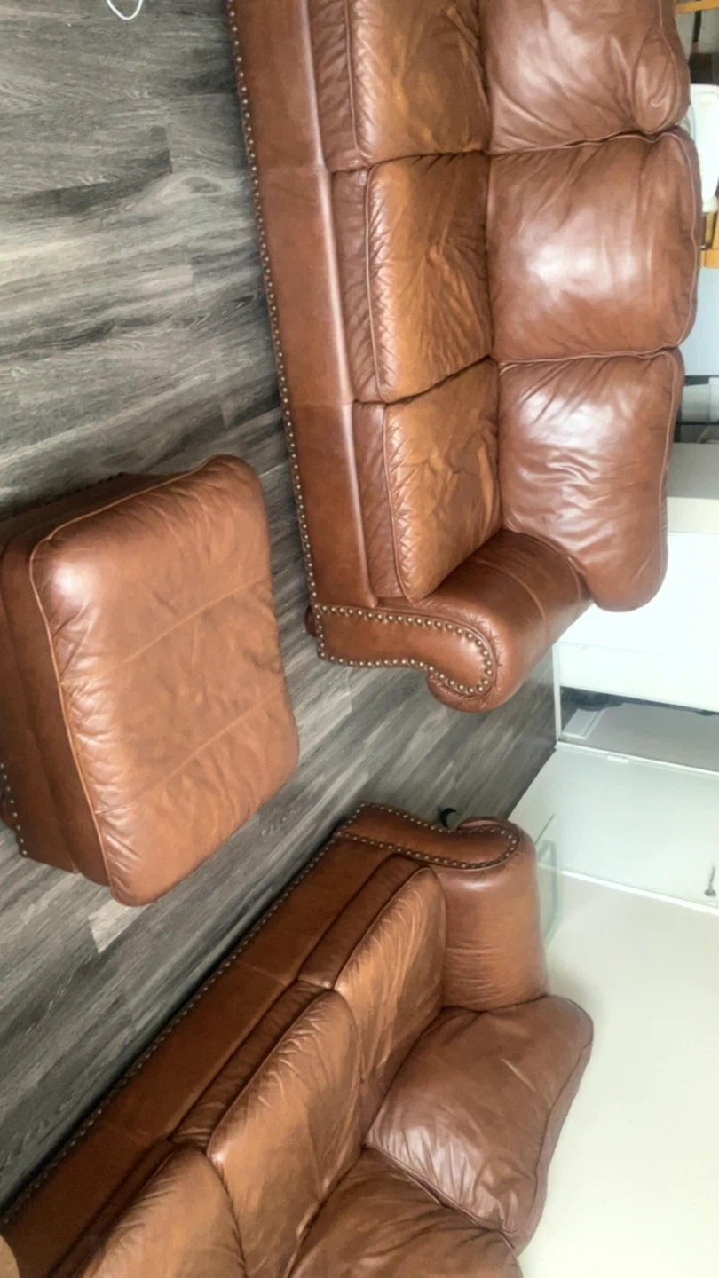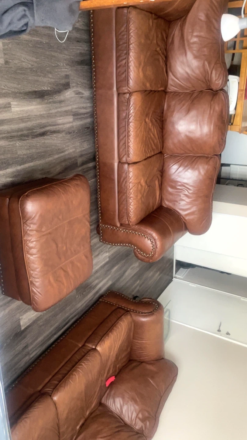 Selling a brown genuine leather living room set in good used condition. Includes two matching 3 seat sofas and a matching ottoman. Classic style with nailhead trim. Genuine leather with normal wear from use but no rips or tears. Very comfortable and sturdy.