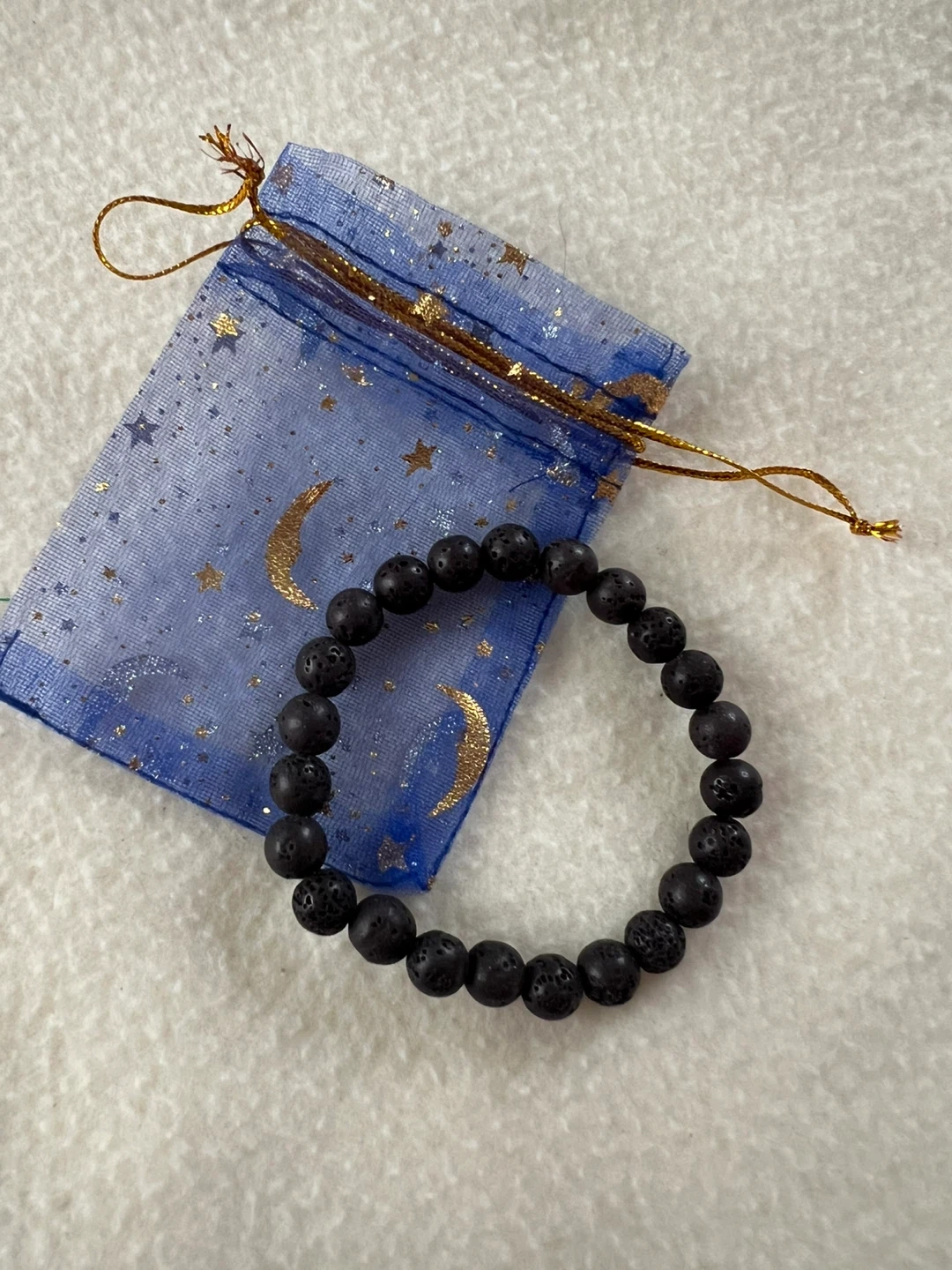 Here's a stylish black lava stone bracelet! It comes with a cute blue pouch with gold stars and moon details. Perfect for adding a touch of zen to your everyday look
