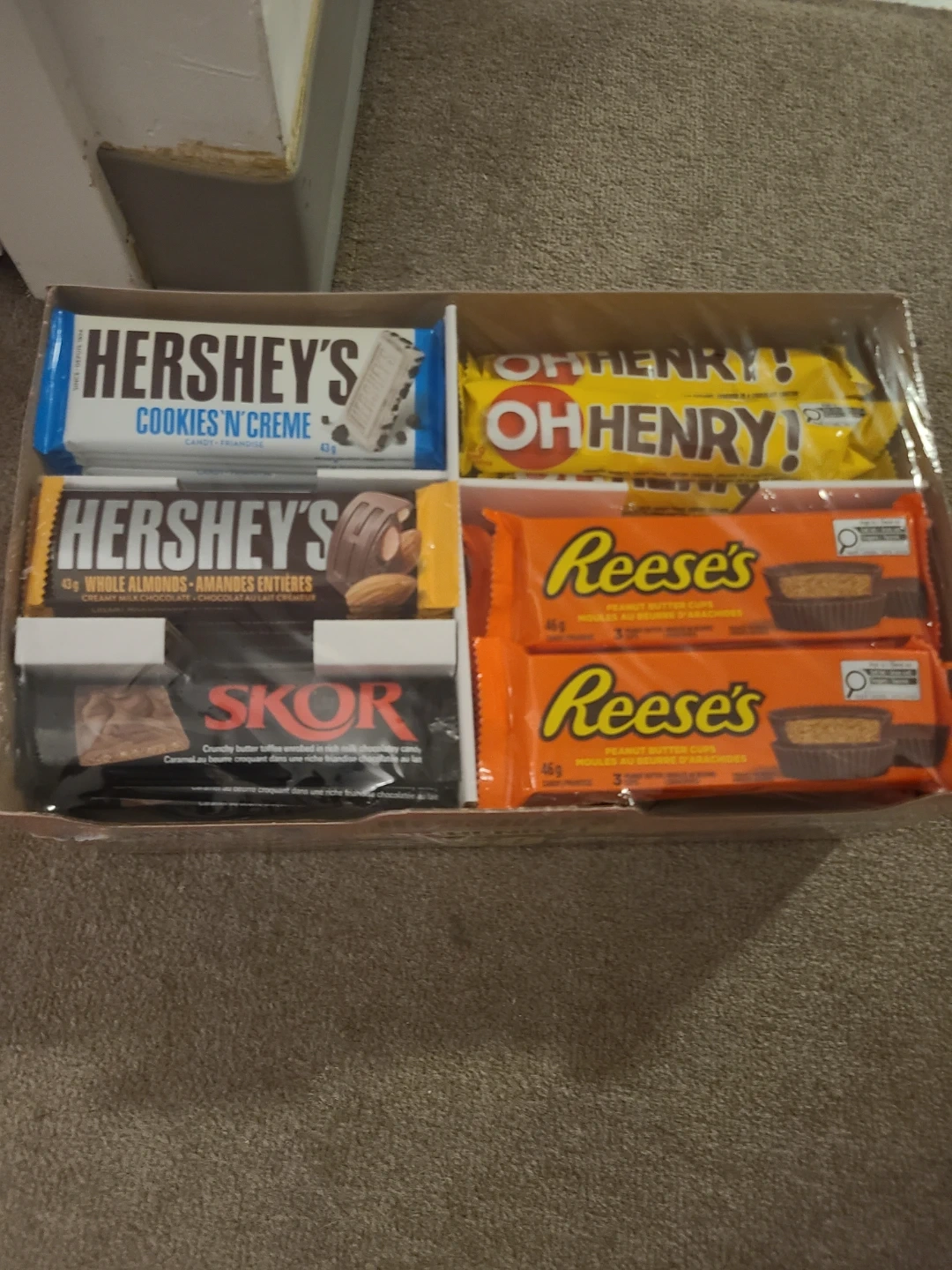 Selling a box of Hershey's assorted full-size chocolate bars. This box includes 50 bars of chocolate from Hershey's, Reese's, Skor, and Oh Henry! Expire March 2026