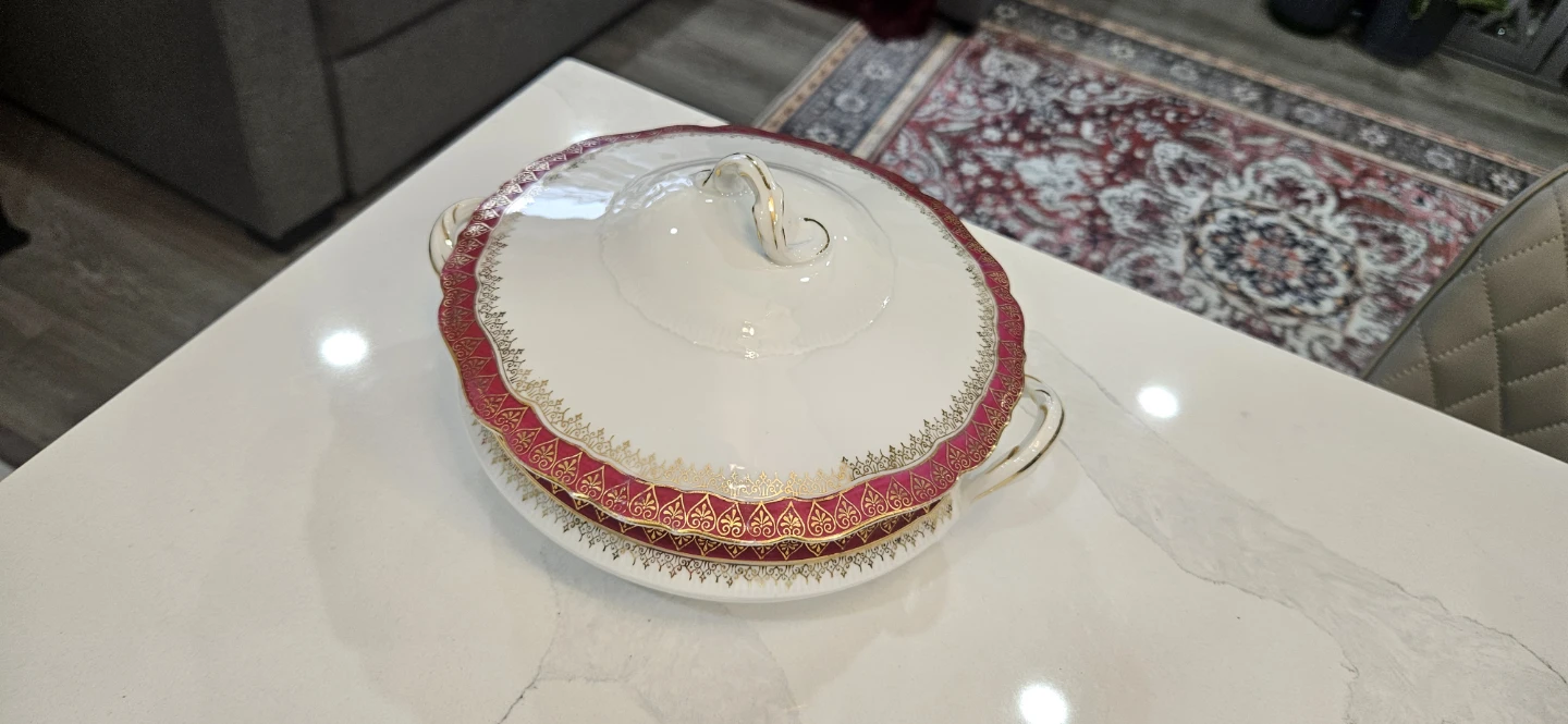 Selling a lovely vintage porcelain soup tureen with a matching lid. It features a beautiful white body with a delicate burgundy and gold trim. Perfect for adding a touch of elegance to your dining table!