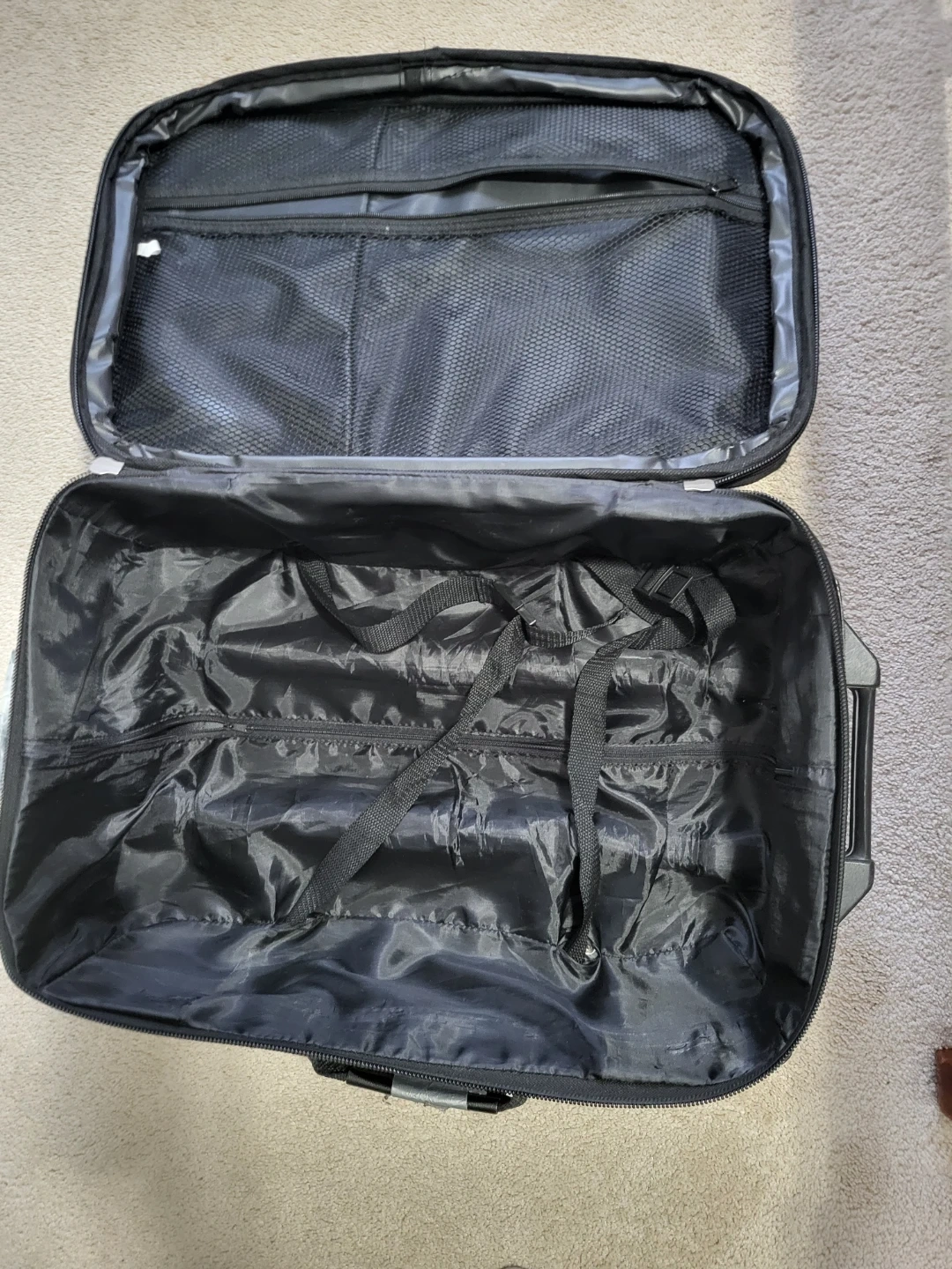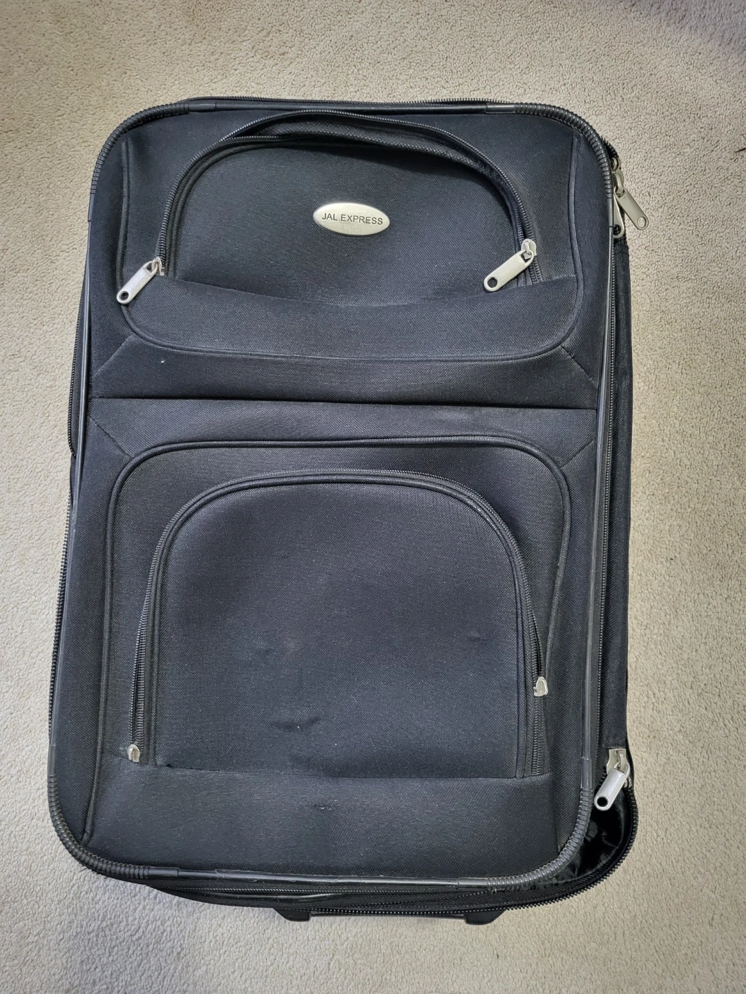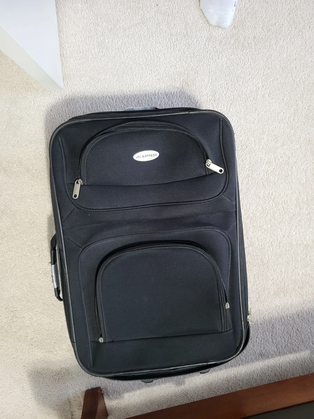 Selling a JAL Express carry-on suitcase in black. It's in good condition and ready for your next trip! It has a few compartments to keep your belongings organized and wheels for easy transport