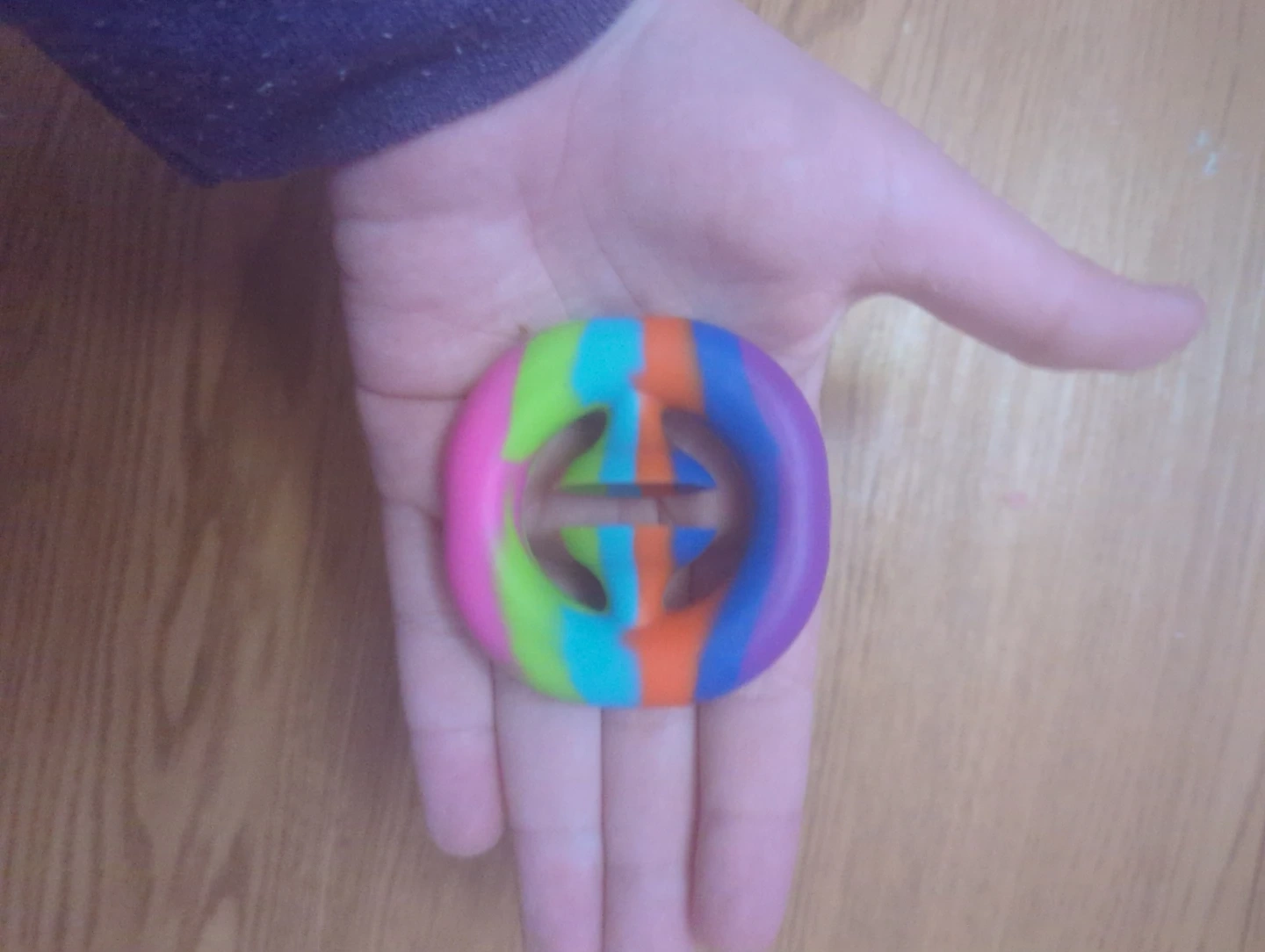 Here's a fun fidget toy! It's round and has a cool rainbow design with pink, green, orange, and purple colours