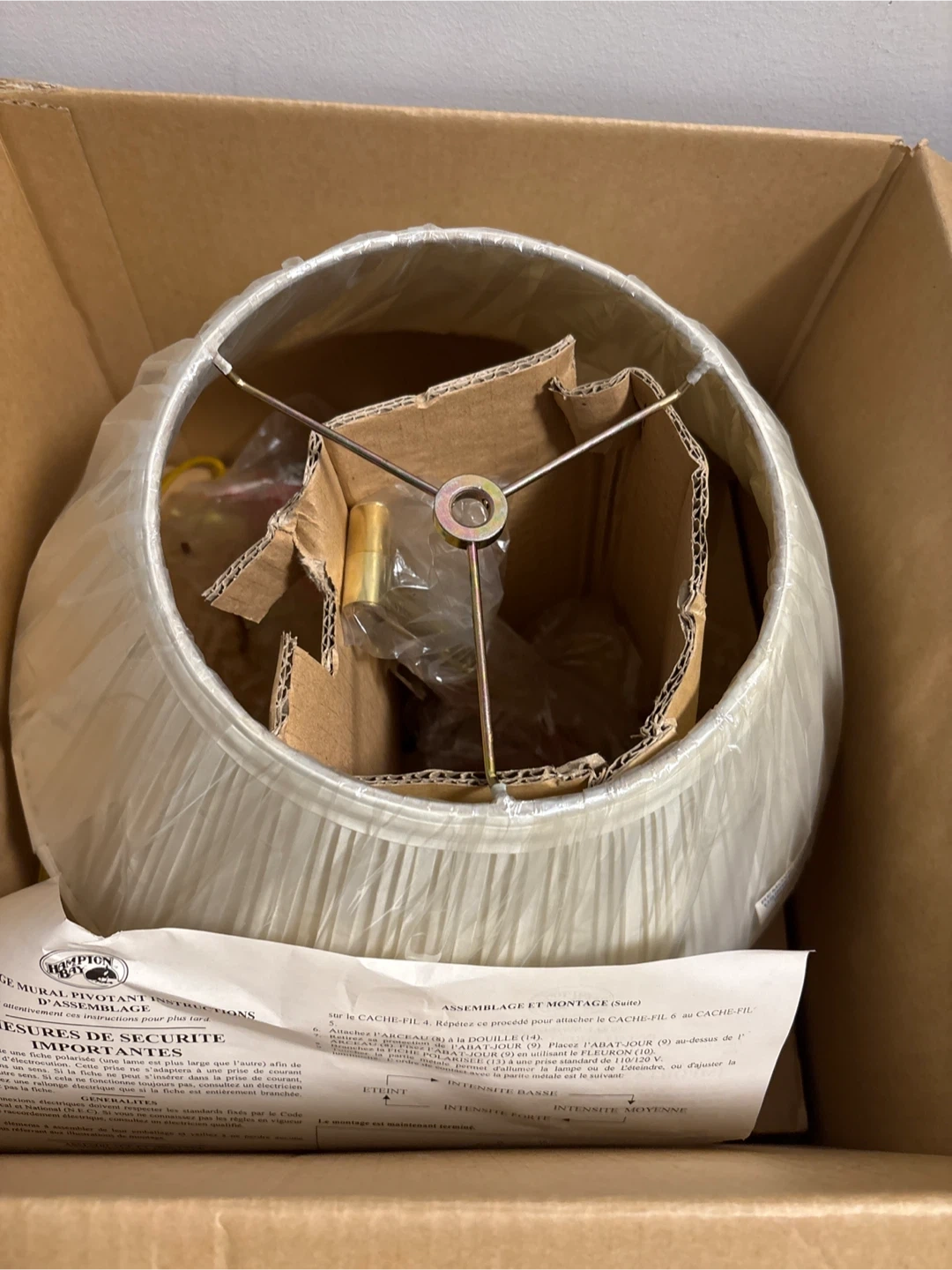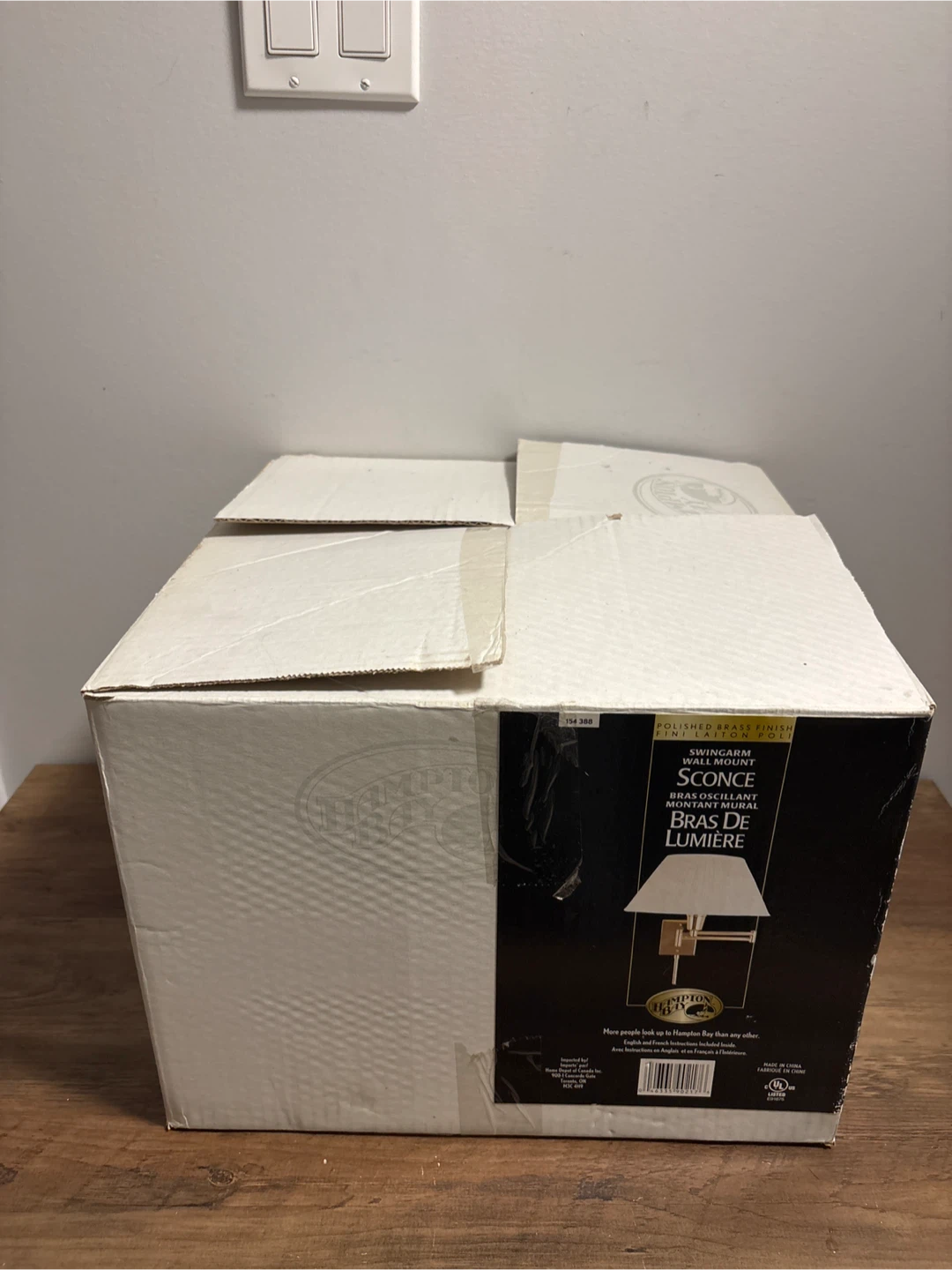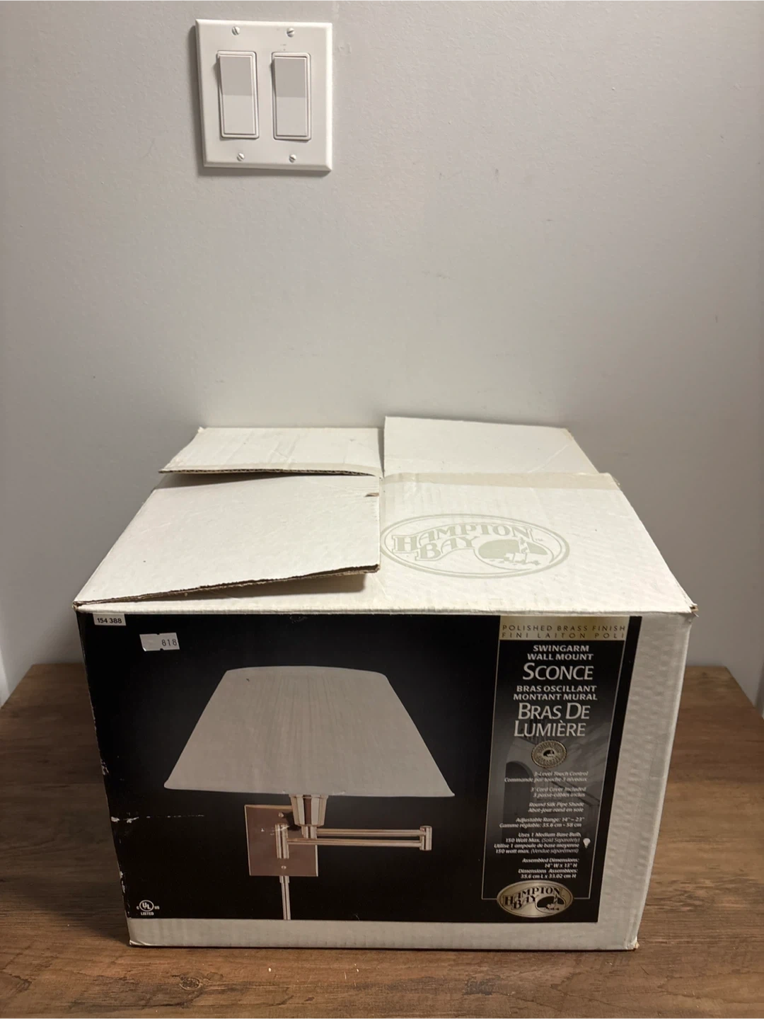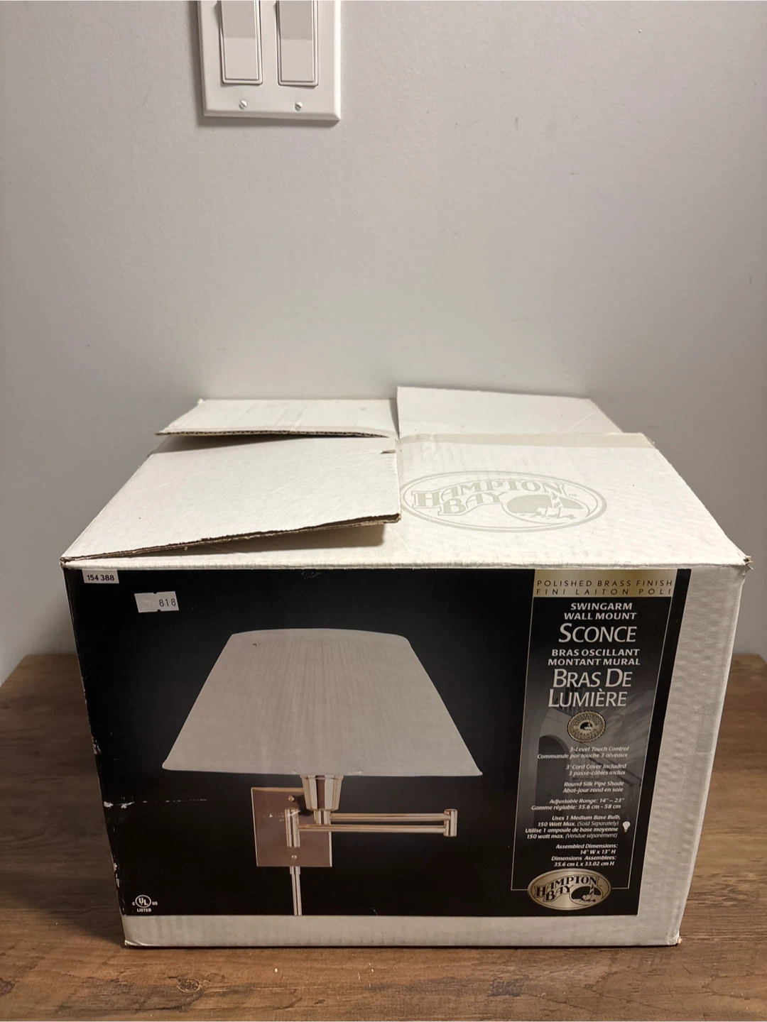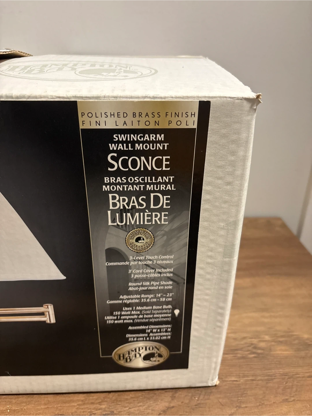 Selling a brand new Hampton Bay swing arm wall mount sconce in polished brass finish! It comes in the original box and includes a round silk pipe shade. The sconce features a 3-level touch control and uses 1 medium base bulb (150 watt max). Assembled dimensions are 14" W x 12" D x 12.5" H (35.6 cm x 31.8 cm x 31.8 cm).