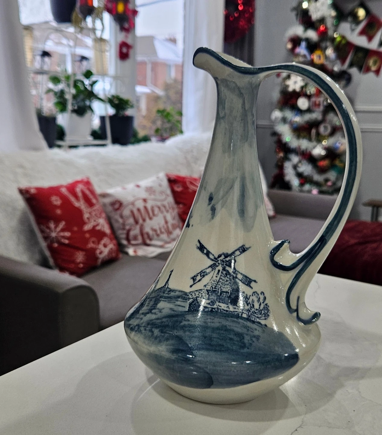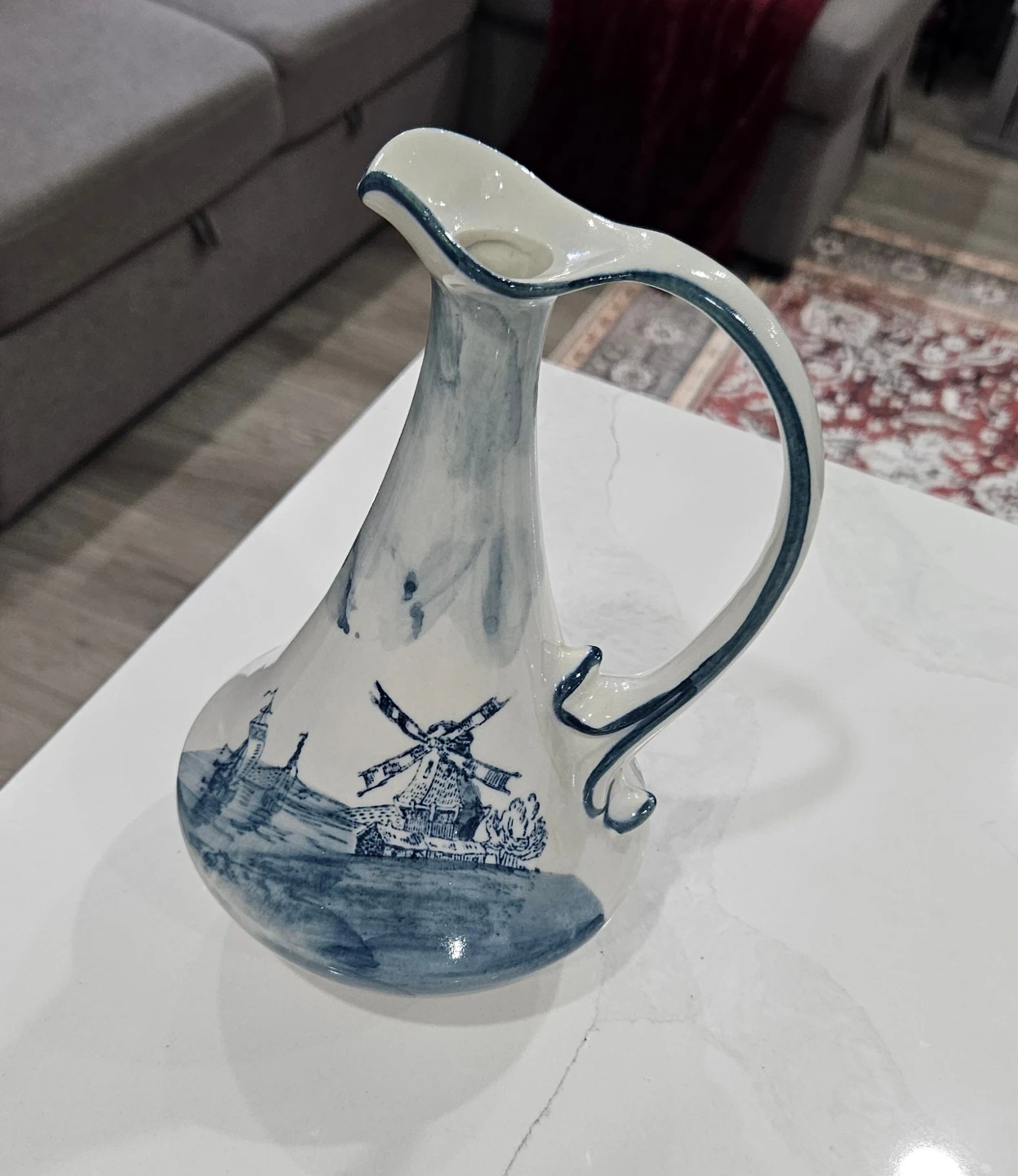 Vintage Delft Blue Ceramic Pitcher with Windmill Design