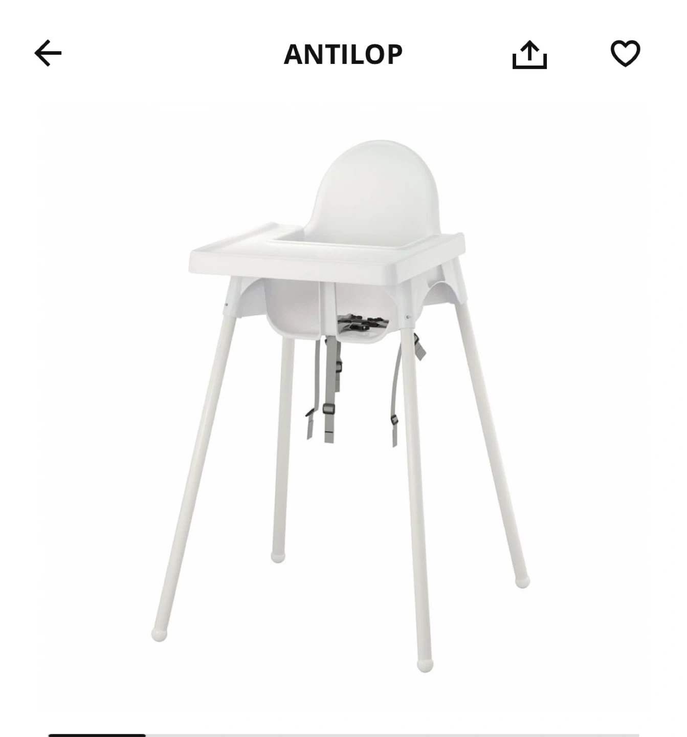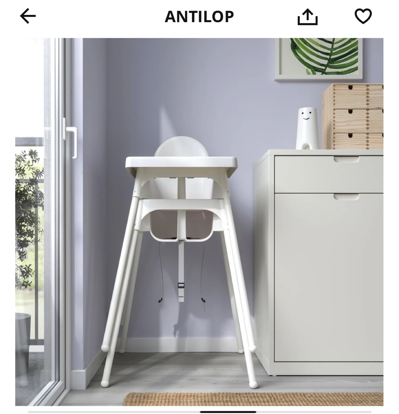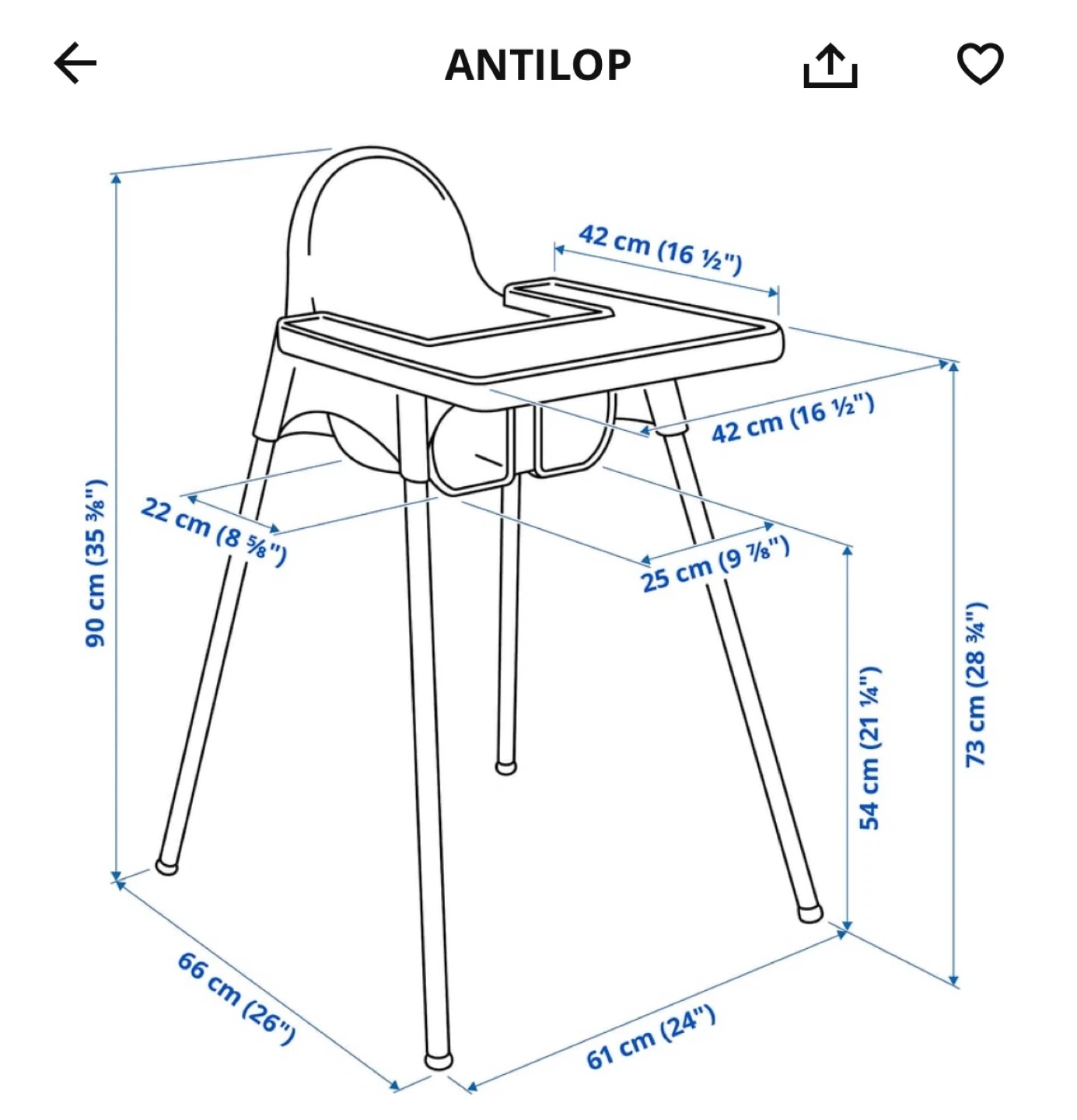 Selling a gently used IKEA Antilop high chair in white. It's super easy to clean and perfect for little ones starting to explore solid foods. The simple design fits into any dining space, and it's lightweight enough to move around easily. Dimensions are approximately 90 cm (35 3/8") tall, 61 cm (24") wide, and 66 cm (26") deep.