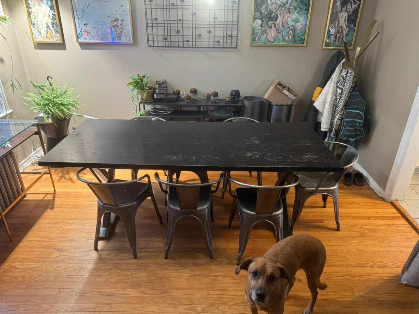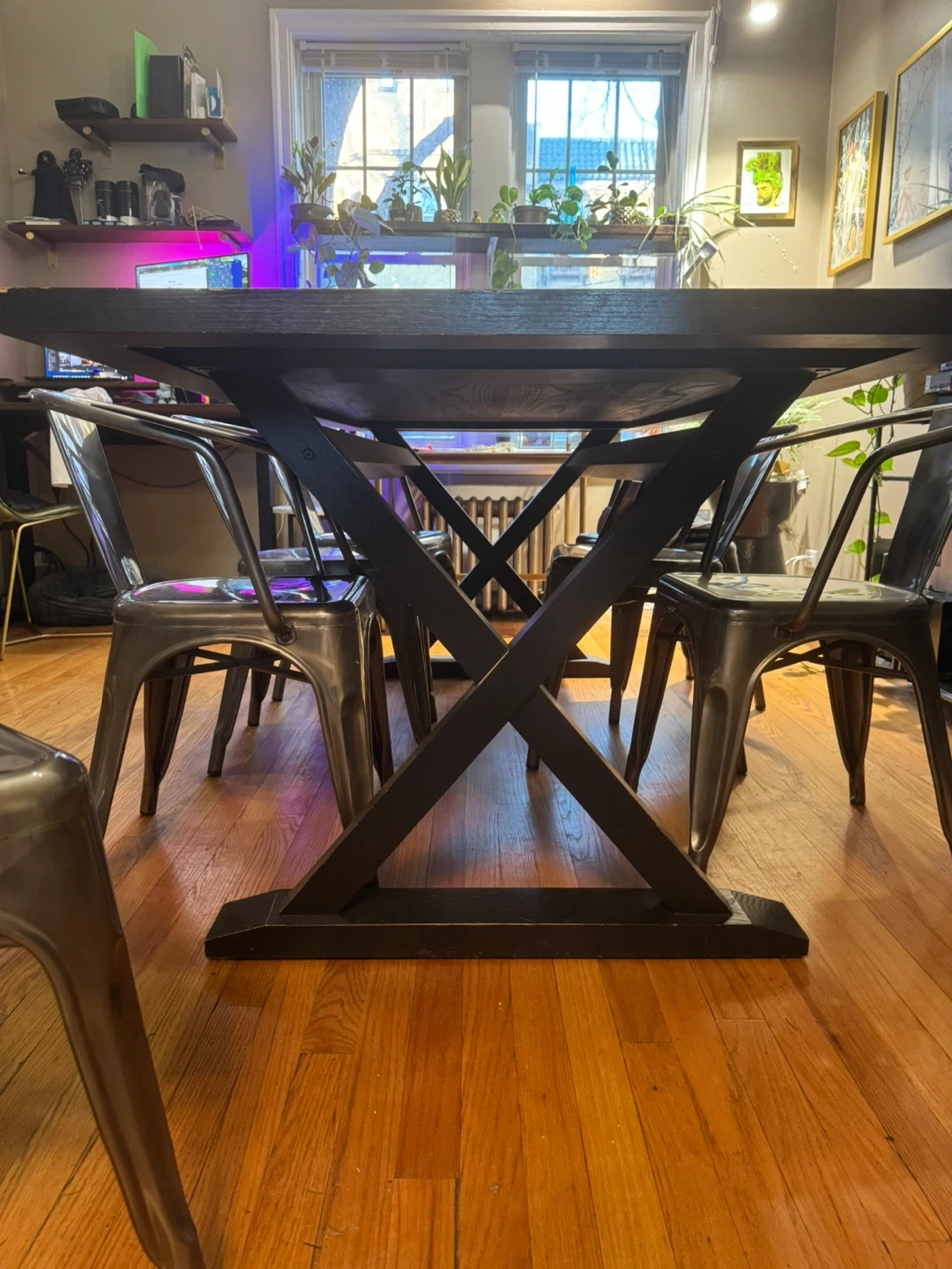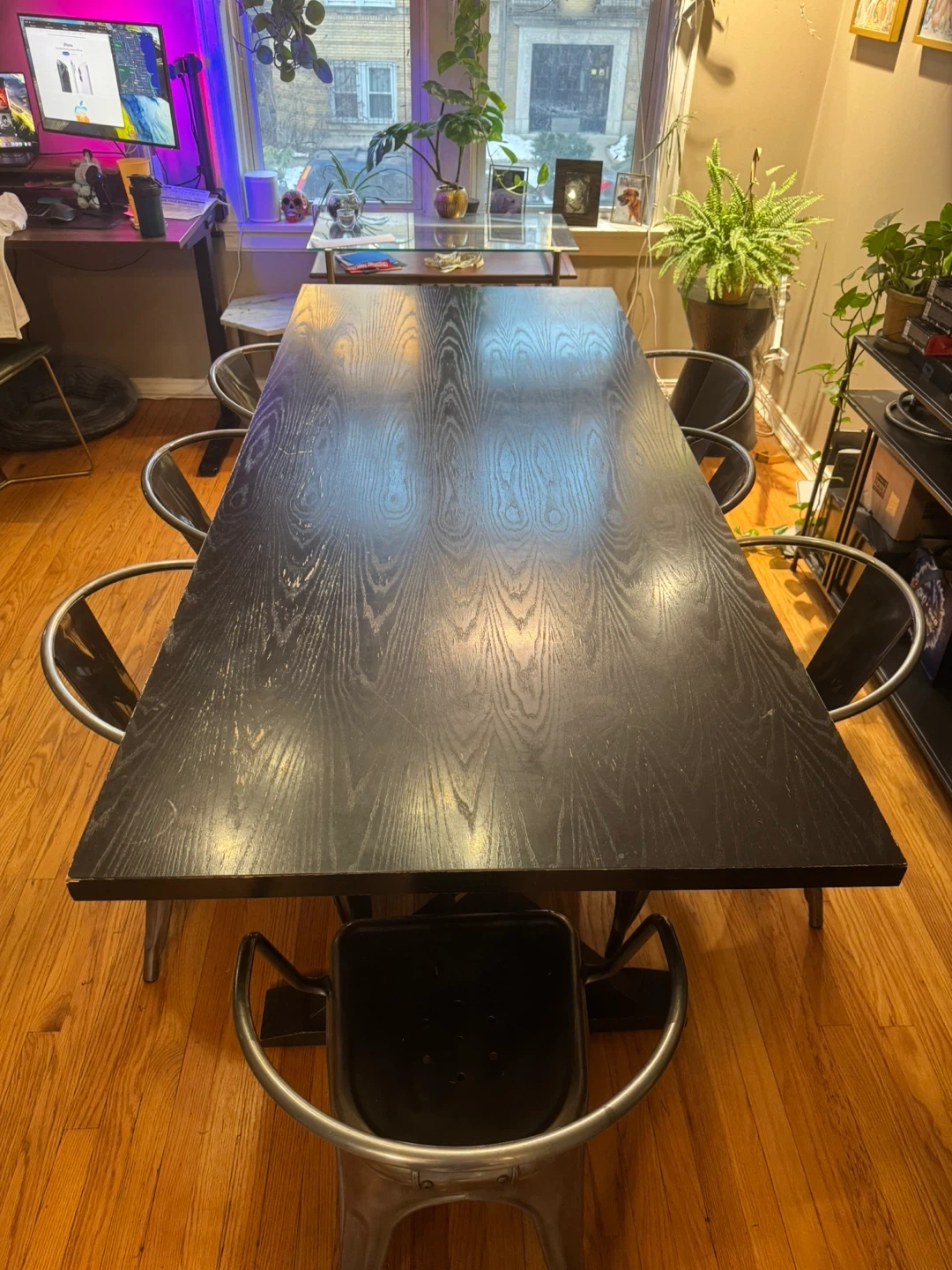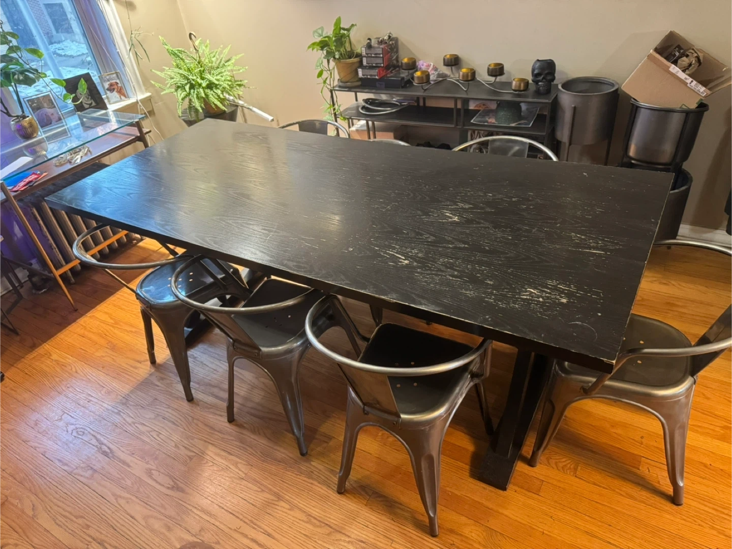 Selling a solid wood black wood dining table. Has some signs of wear, spots where black is worn down. Could easily be repainted etc. Otherwise it’s been a great table. Only selling cause I’m replacing with a smaller one.