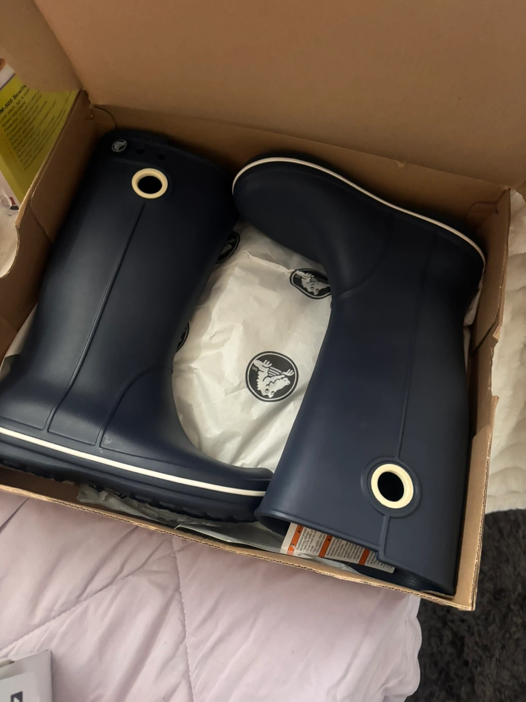 Navy blue Crocs rain boots in original box. These rubber boots are waterproof and durable. They feature a comfortable fit for wet weather. Includes original packaging.
