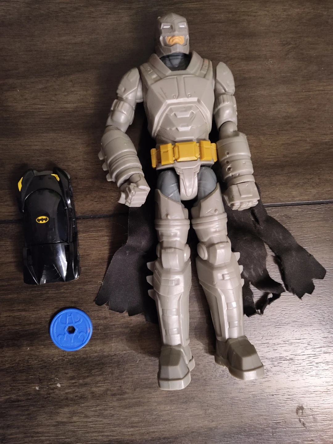 an Armored Batman action figure! It comes with a Batmobile and a blue disc accessory. Great for any Batman fan!