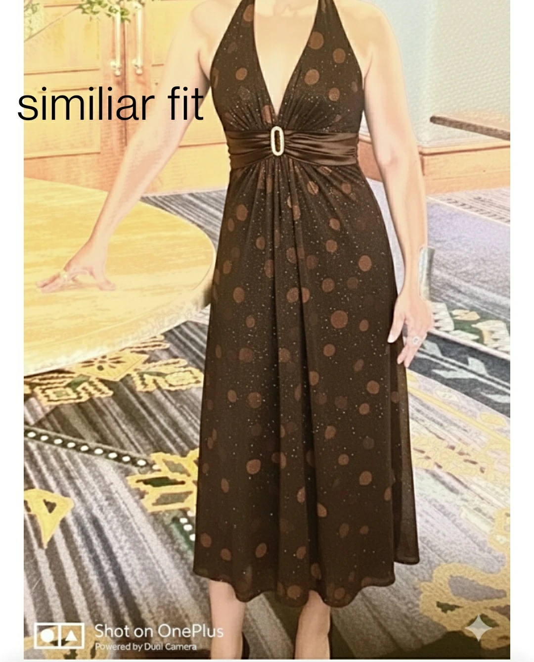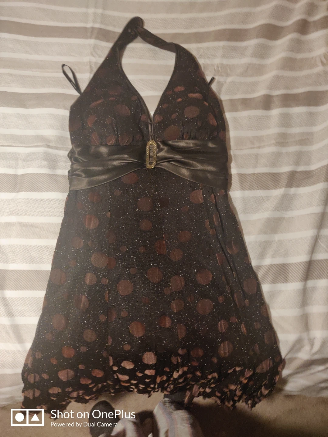 Step into the spotlight with our exquisite Starlight Halter Dress. Crafted in a rich, sophisticated chocolate brown, this dress features a shimmering polka-dot pattern that catches the light with every movement, creating a subtle, celestial sparkle.