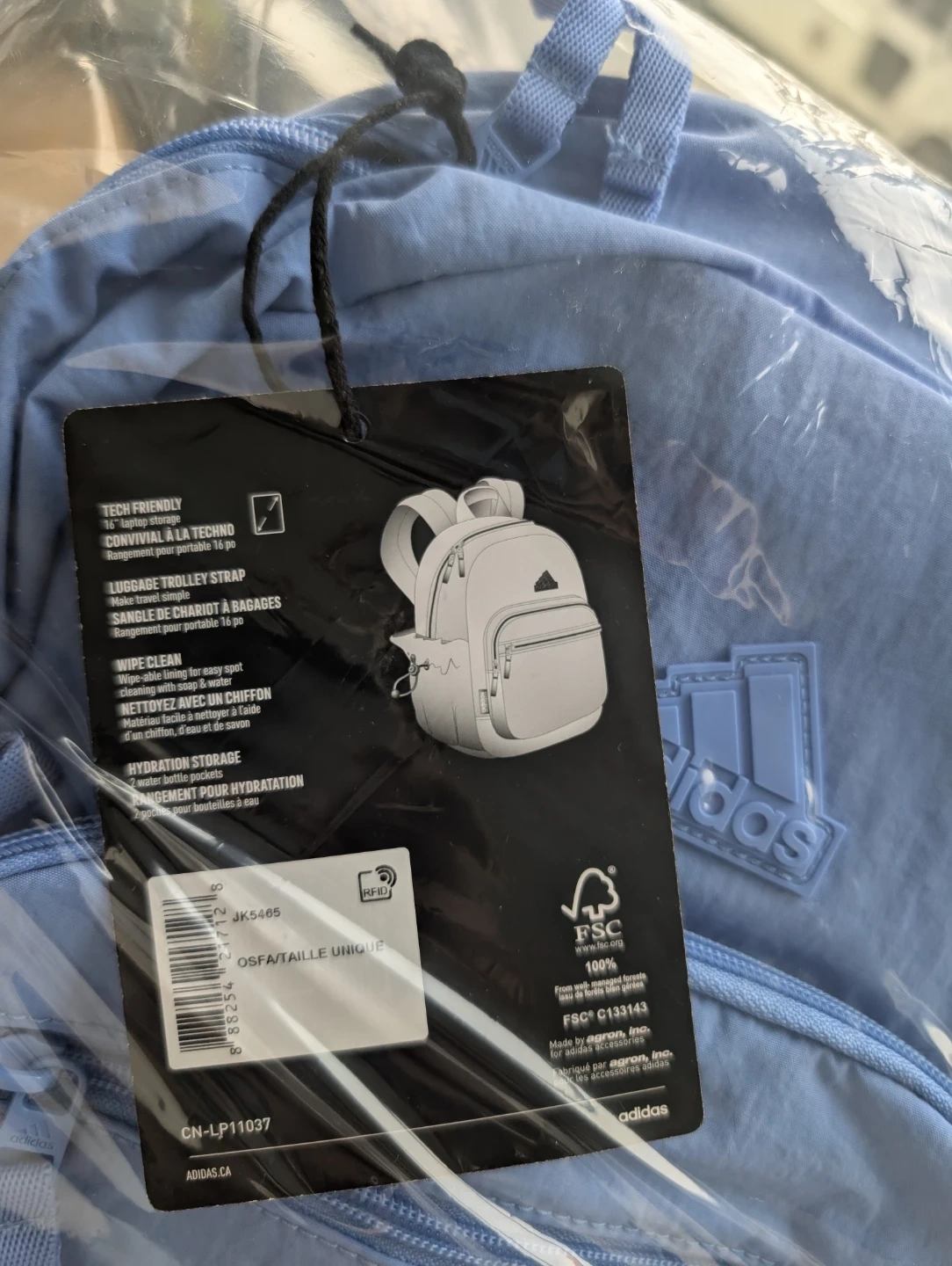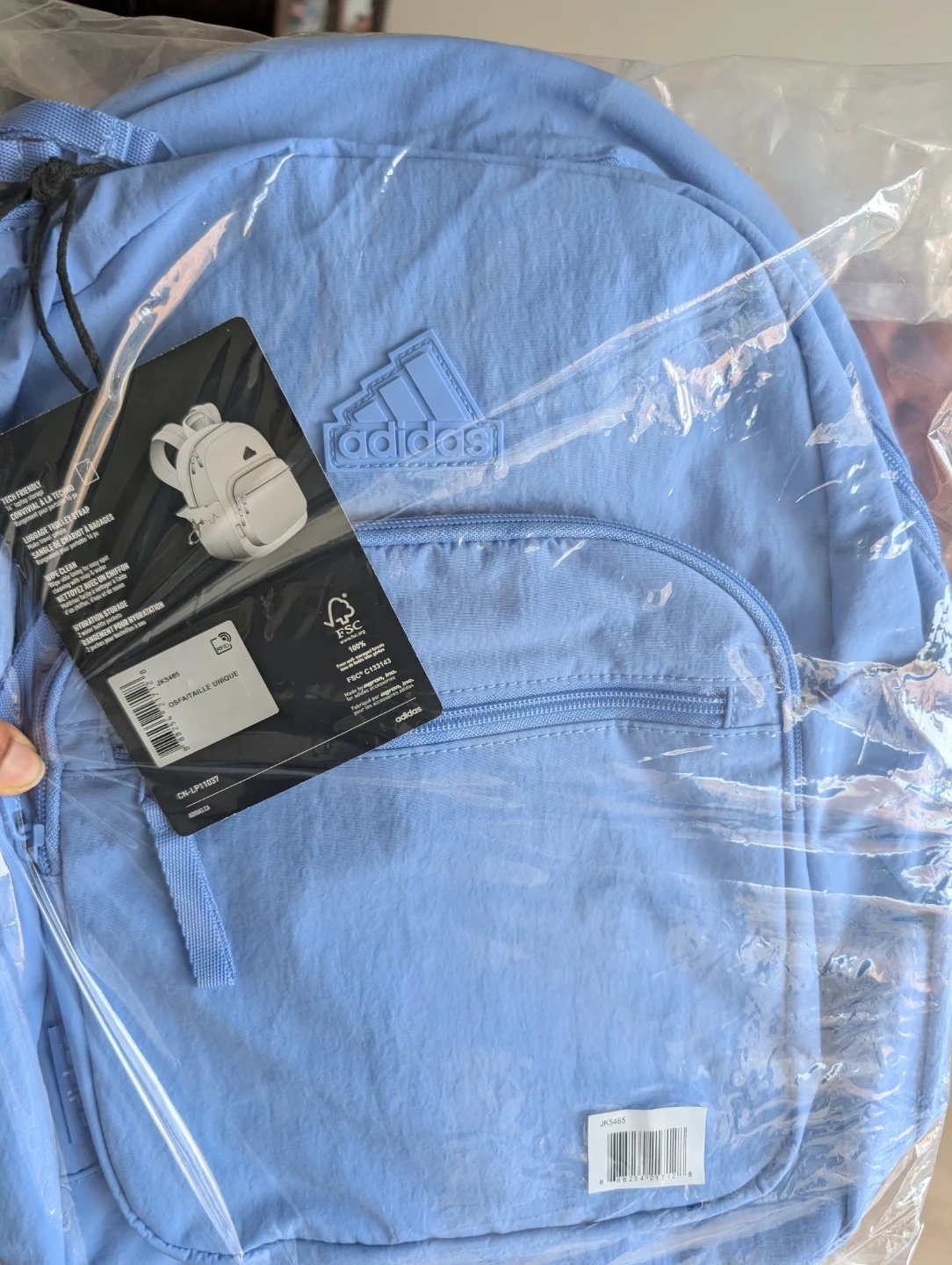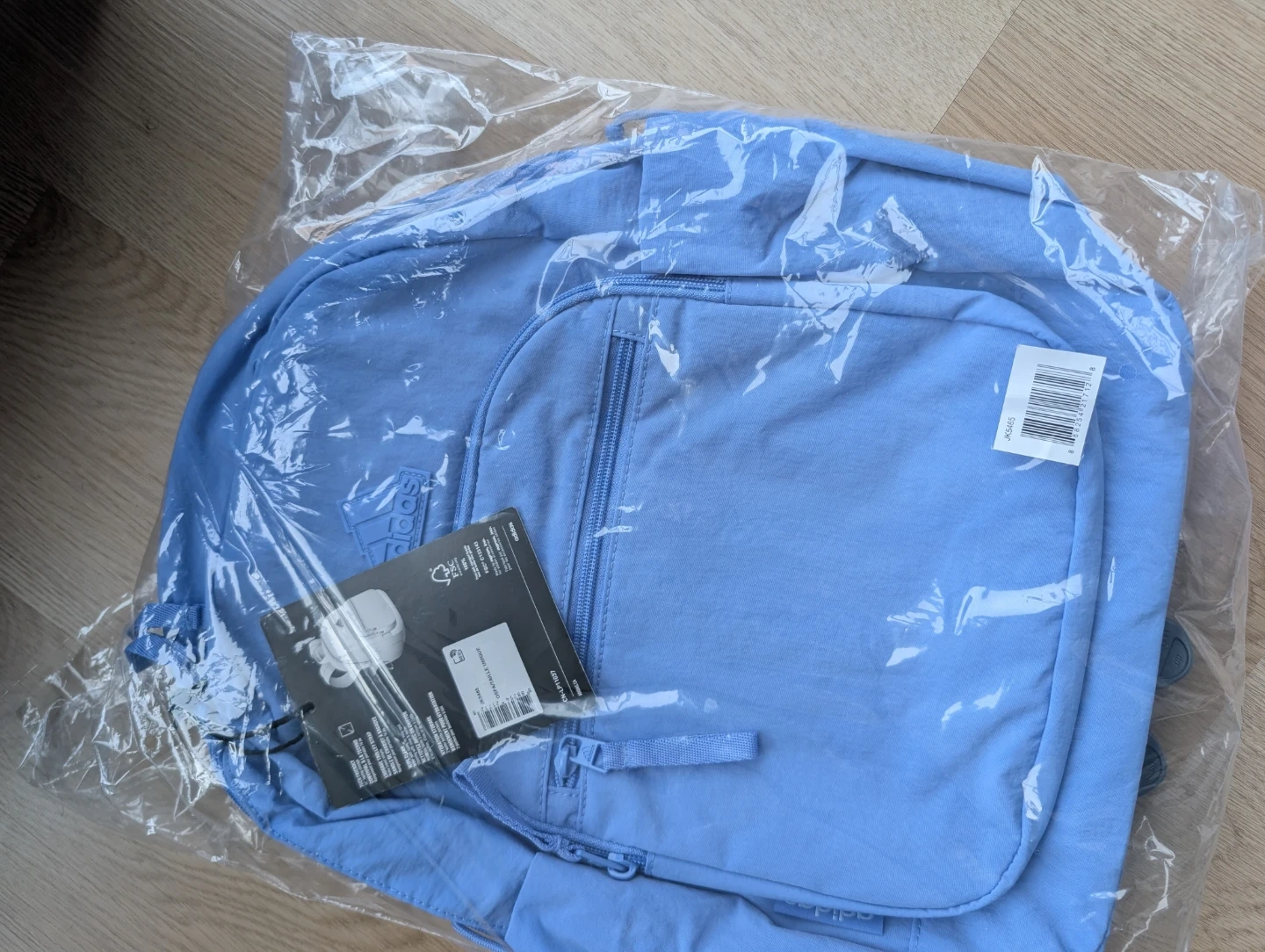 This Adidas backpack is brand new! It's a lovely light blue colour, perfect for carrying your essentials. It's lightweight and portable, making it great for everyday use or travel