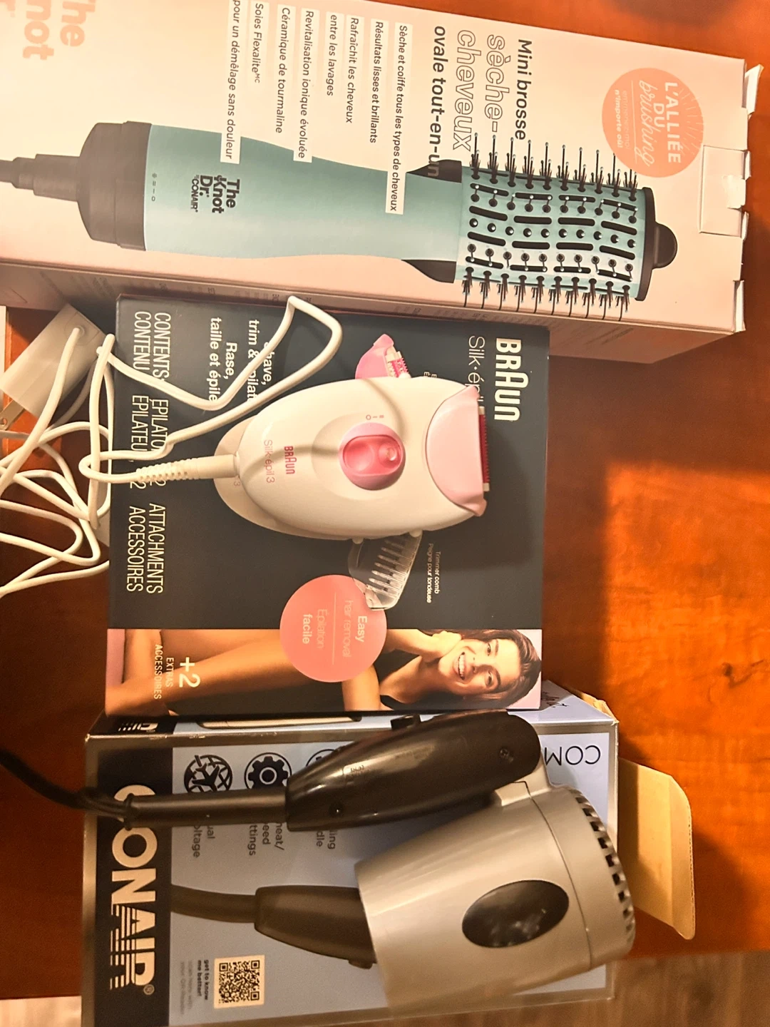 Selling a Braun Silk-épil 3 epilator,Conair hair dryer and curling brush . Comes with their original boxes and accessories. The epilator provides easy hair removal and includes extra attachments. The hair dryer is compact and great for travel! Hair curling gives you great curls.