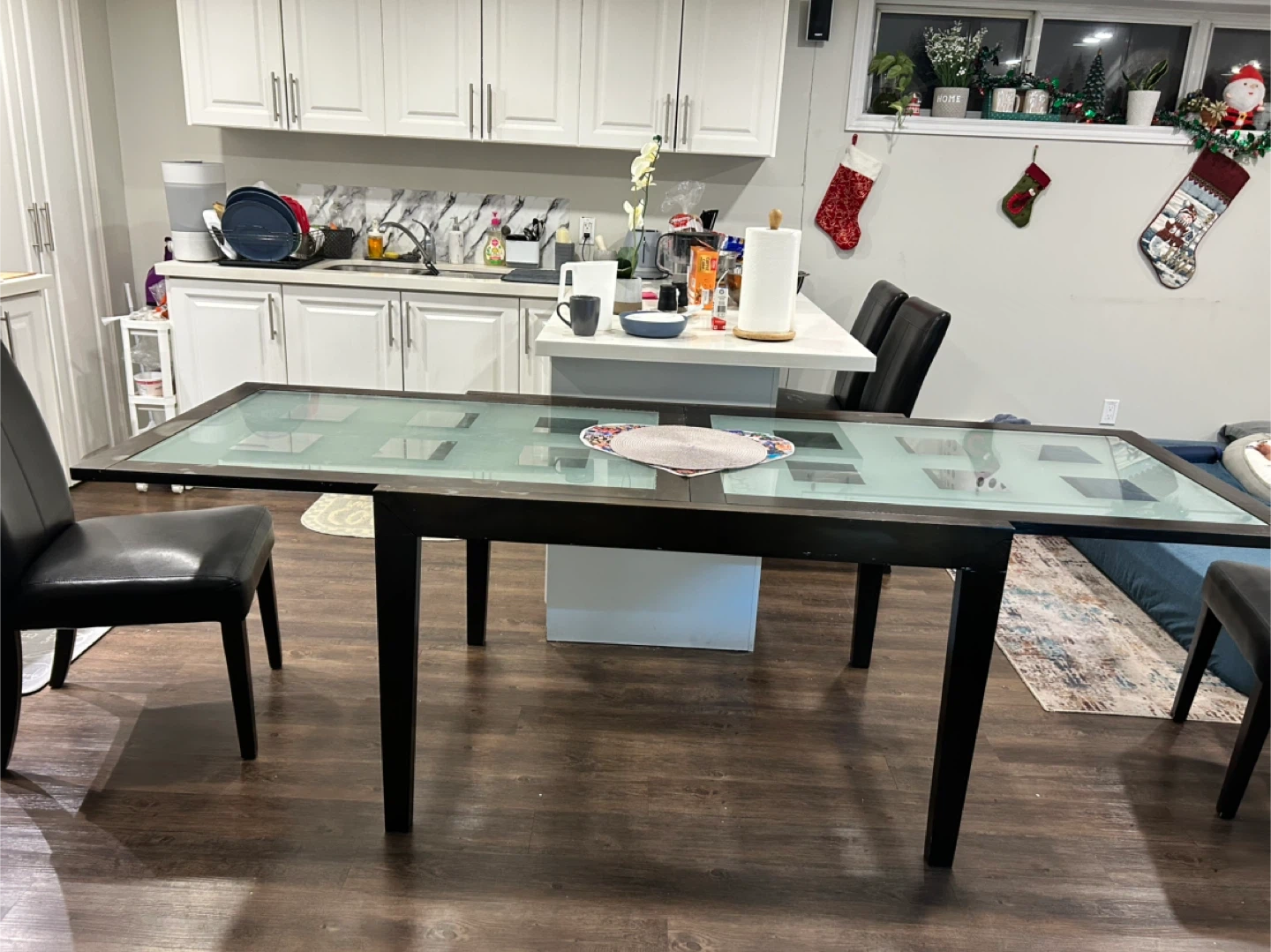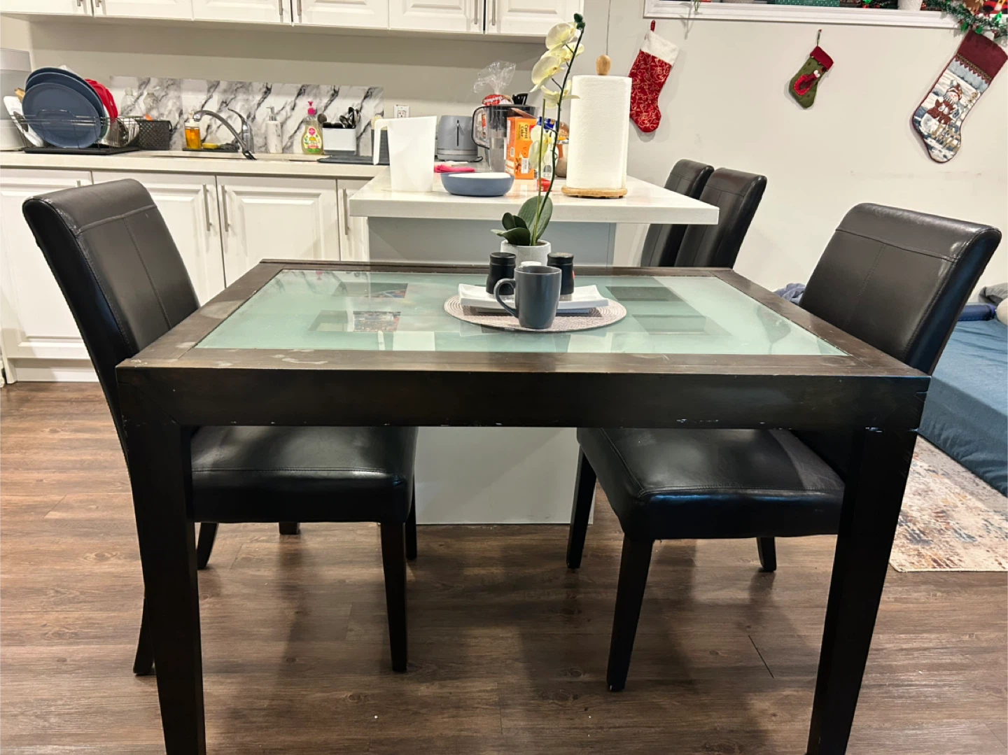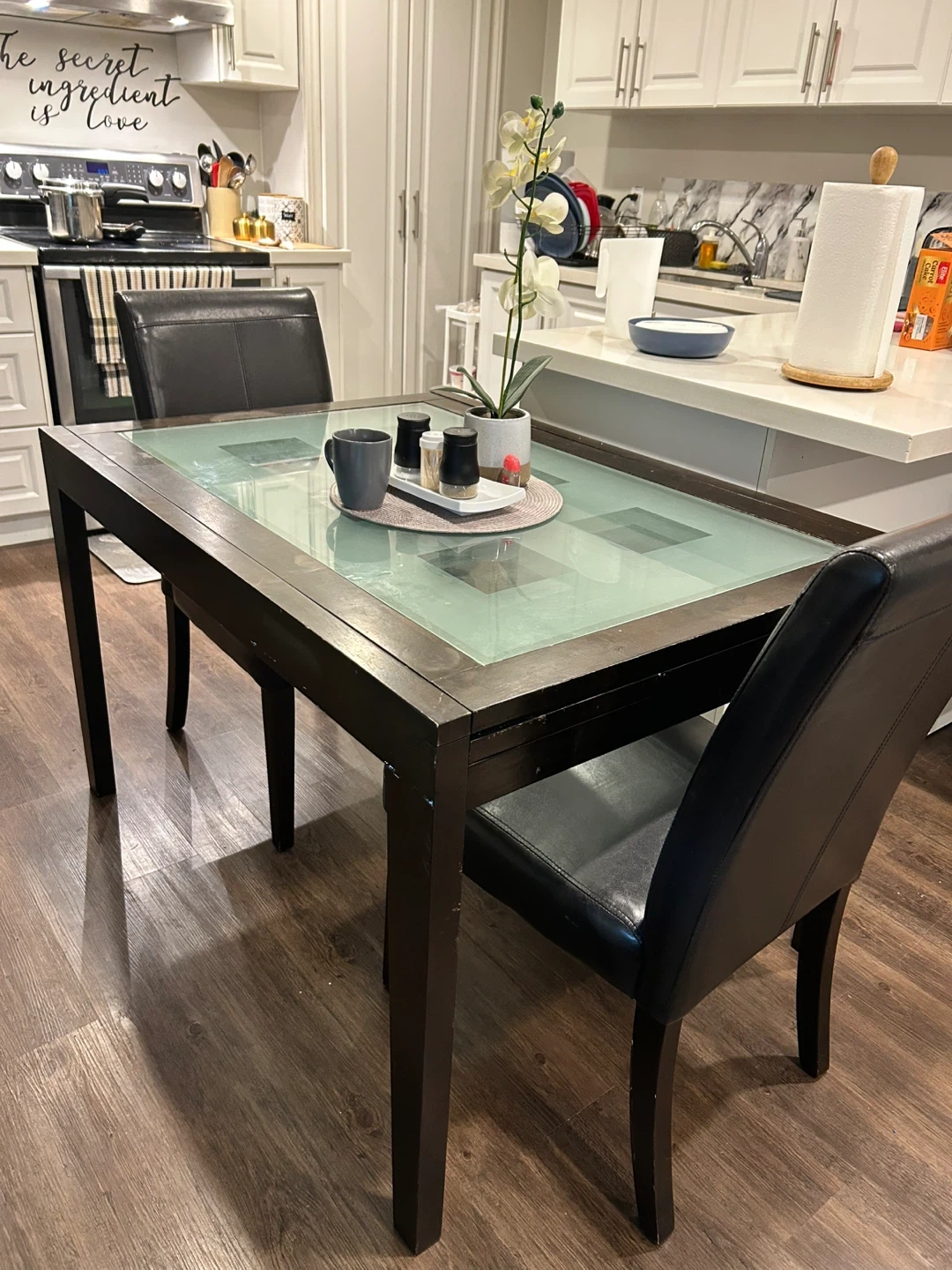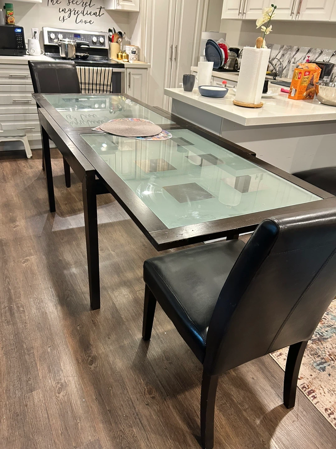 Selling a dining table with four chairs. The table features a glass top and a dark wood frame. The chairs are black with leather seats. It's a great set for a smaller dining area!
