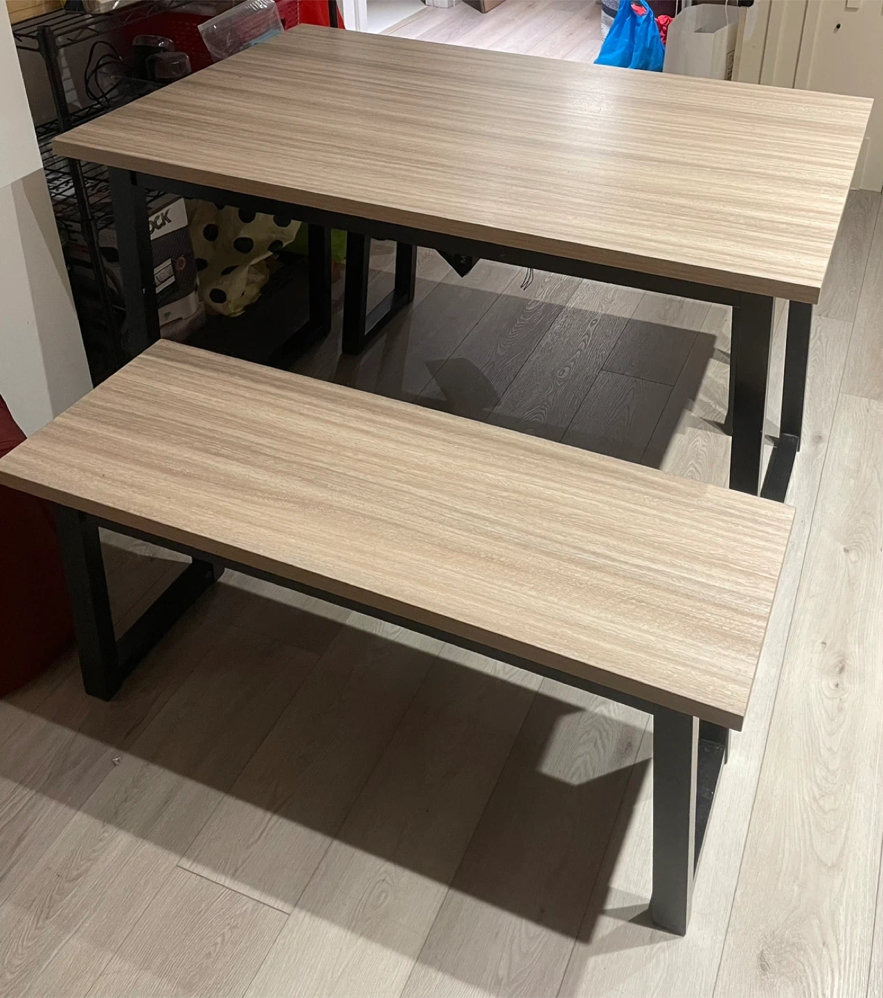 Selling a dining table and bench set. It's in good condition and would be great for a smaller space. The table and bench have a light wood finish with black metal legs. Perfect for a kitchen or dining area!