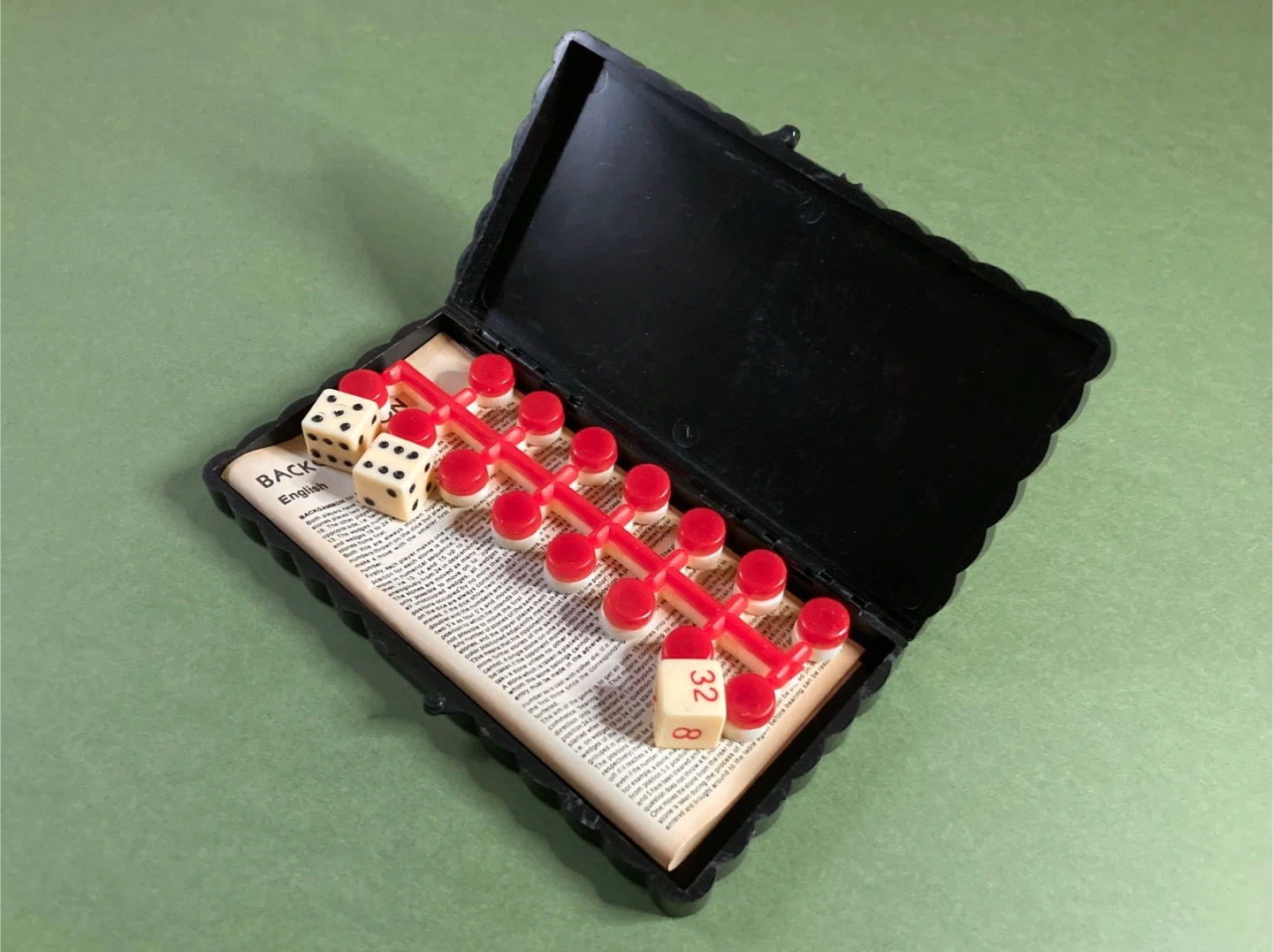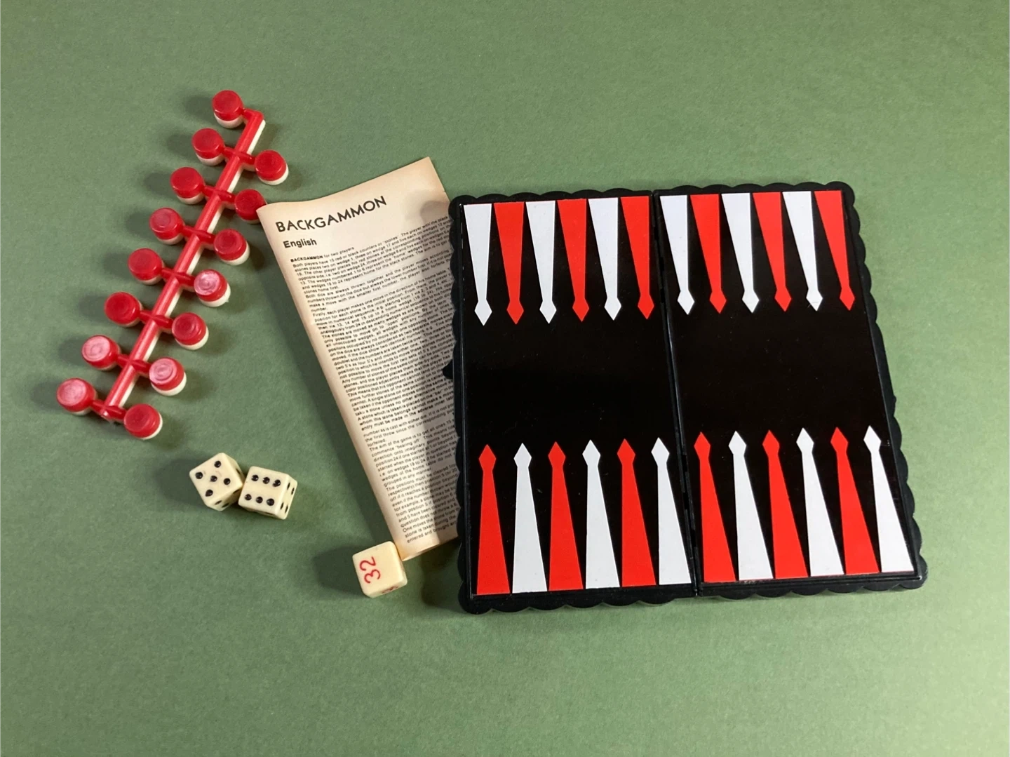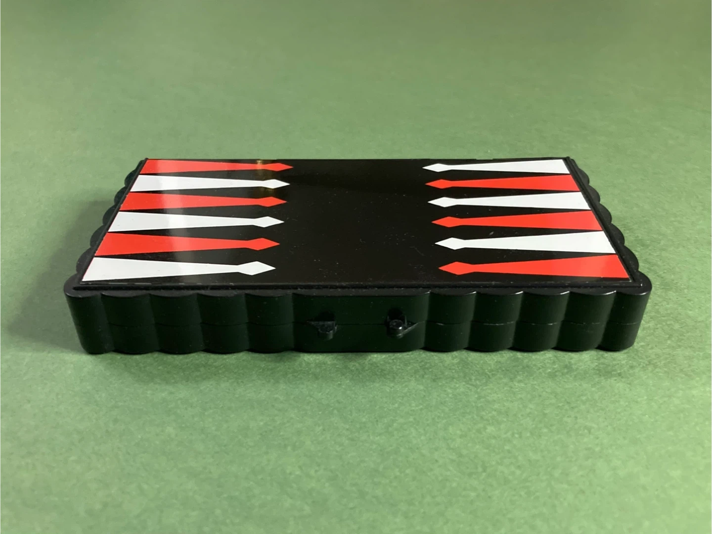 Charming vintage mini travel backgammon game. Take this on your trips and look away from your phone or just style it on a bookshelf for a graphic pop. Features a very cool, graphic black, white, and red cover with scalloped edges. Pieces are magnetic and they stick to the board. All the pieces are still intact and it includes the dice and a mini instruction card. The only issue is one piece is missing the little magnetic backing. Never used! Closed it measures 2 3/4β x 5 3/4β.