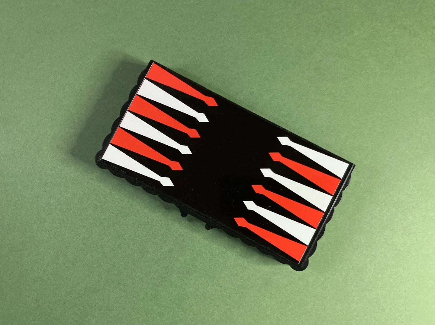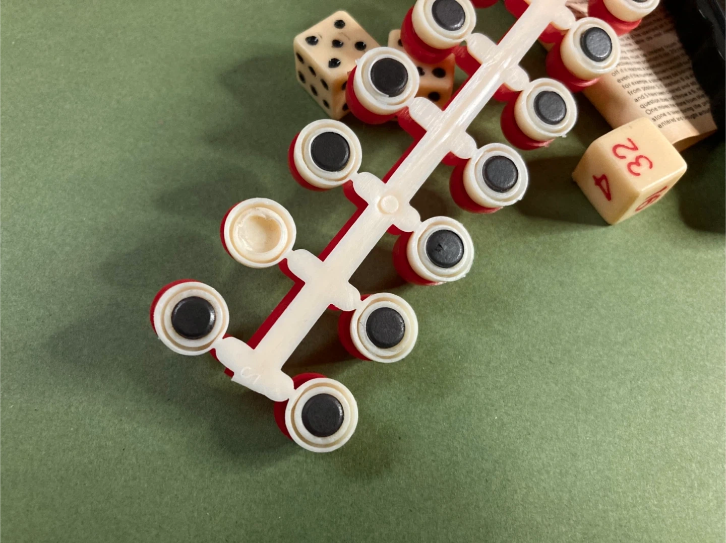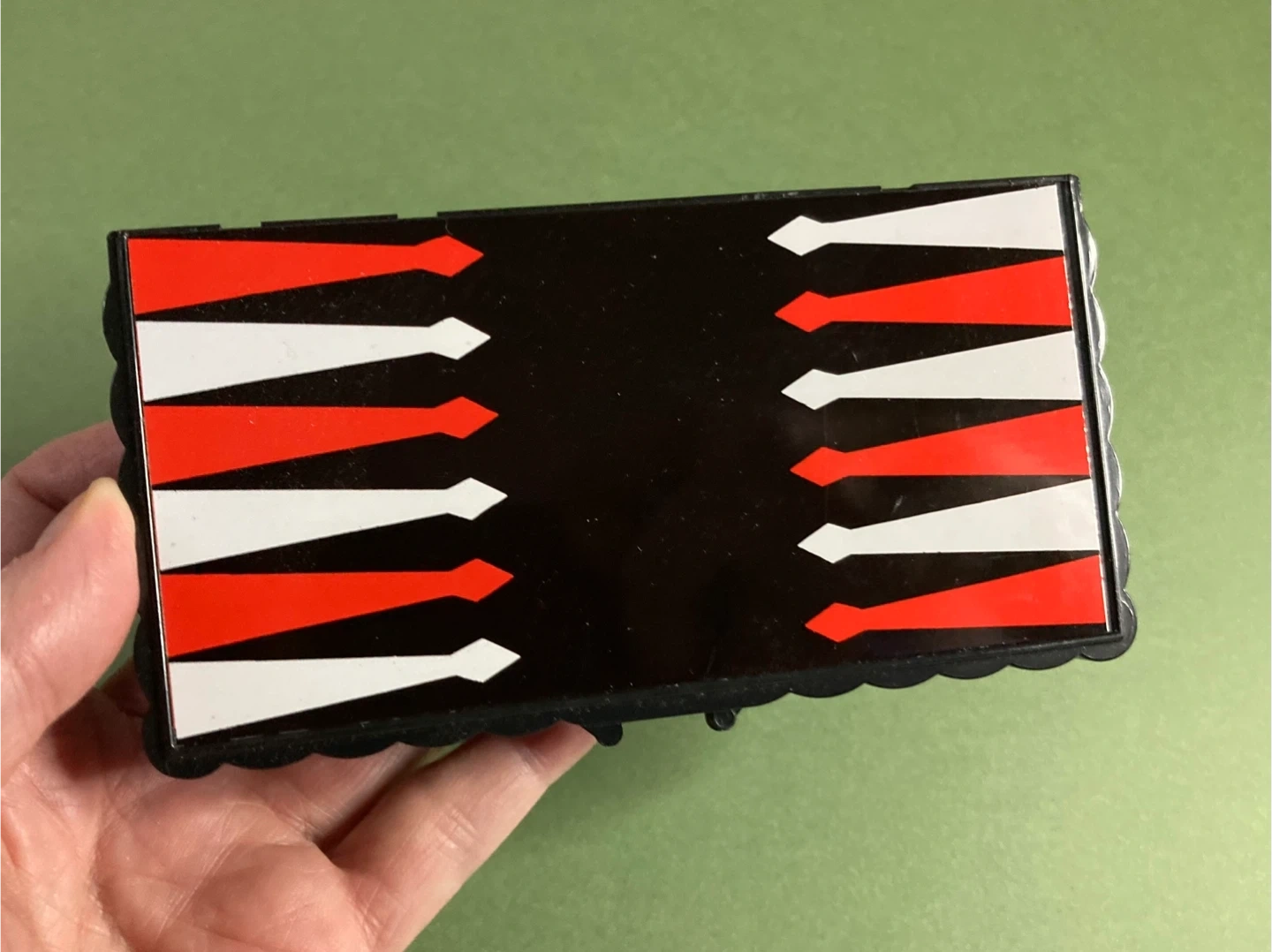 Charming vintage mini travel backgammon game. Take this on your trips and look away from your phone or just style it on a bookshelf for a graphic pop. Features a very cool, graphic black, white, and red cover with scalloped edges. Pieces are magnetic and they stick to the board. All the pieces are still intact and it includes the dice and a mini instruction card. The only issue is one piece is missing the little magnetic backing. Never used! Closed it measures 2 3/4β x 5 3/4β.