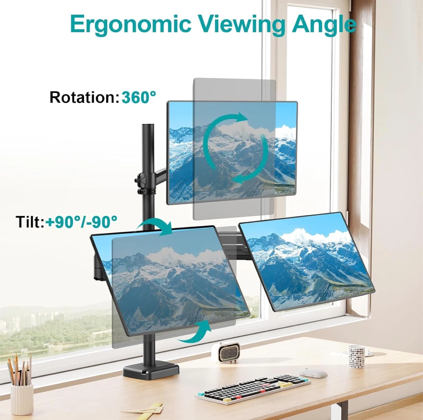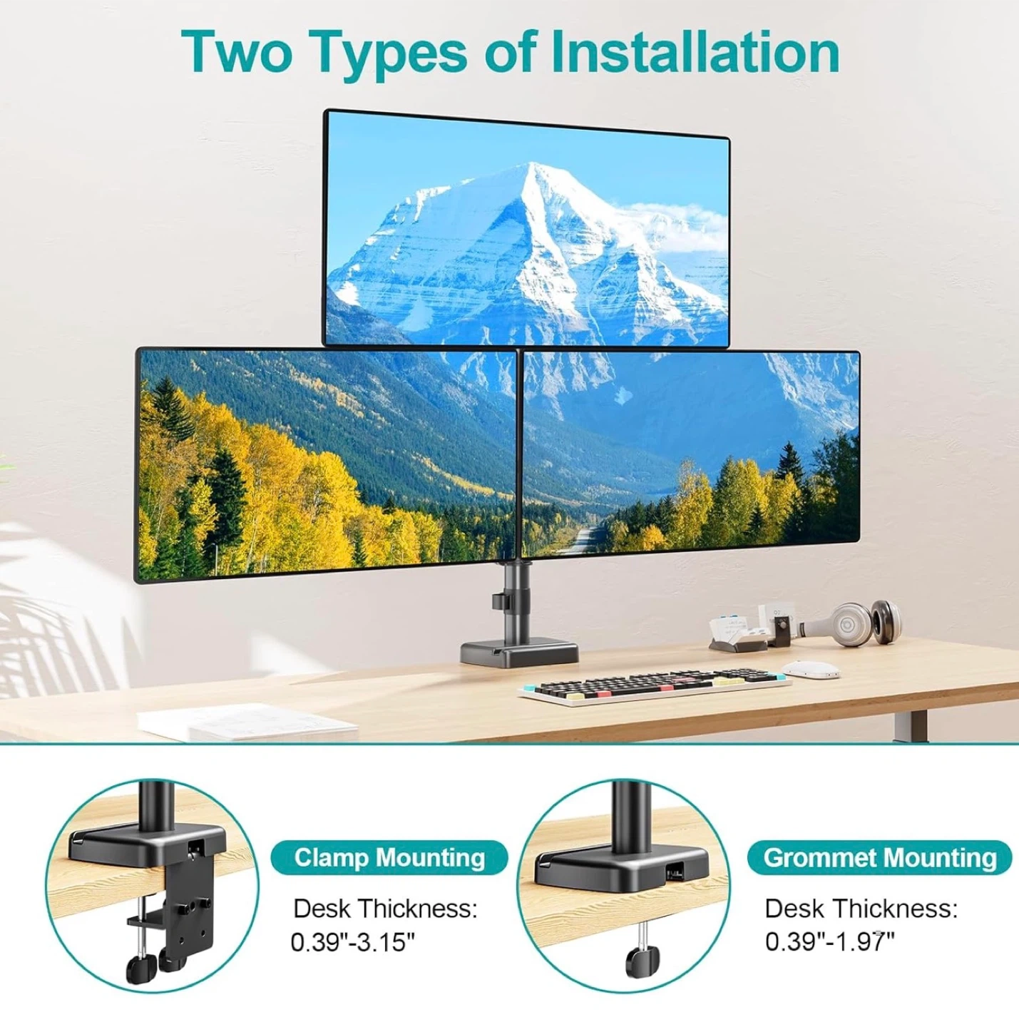 Selling a monitor mount stand that can support dual or triple monitors. It features an ergonomic viewing angle with 360° rotation and +90°/-90° tilt. The stand also has two types of installation: clamp mounting and grommet mounting. Desk thickness for both mounting types is 0.39"-3.15" for clamp mounting and 0.39"-1.97" for grommet mounting. The box is included!