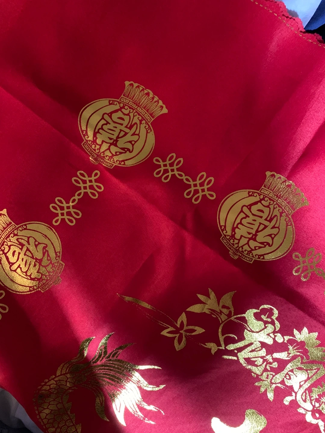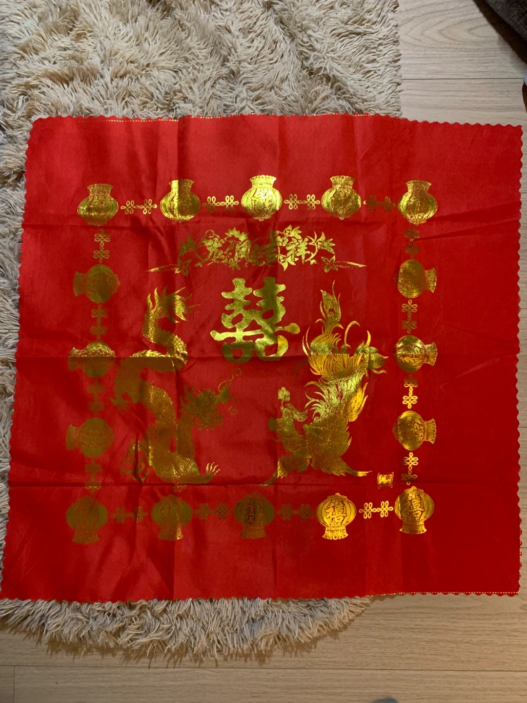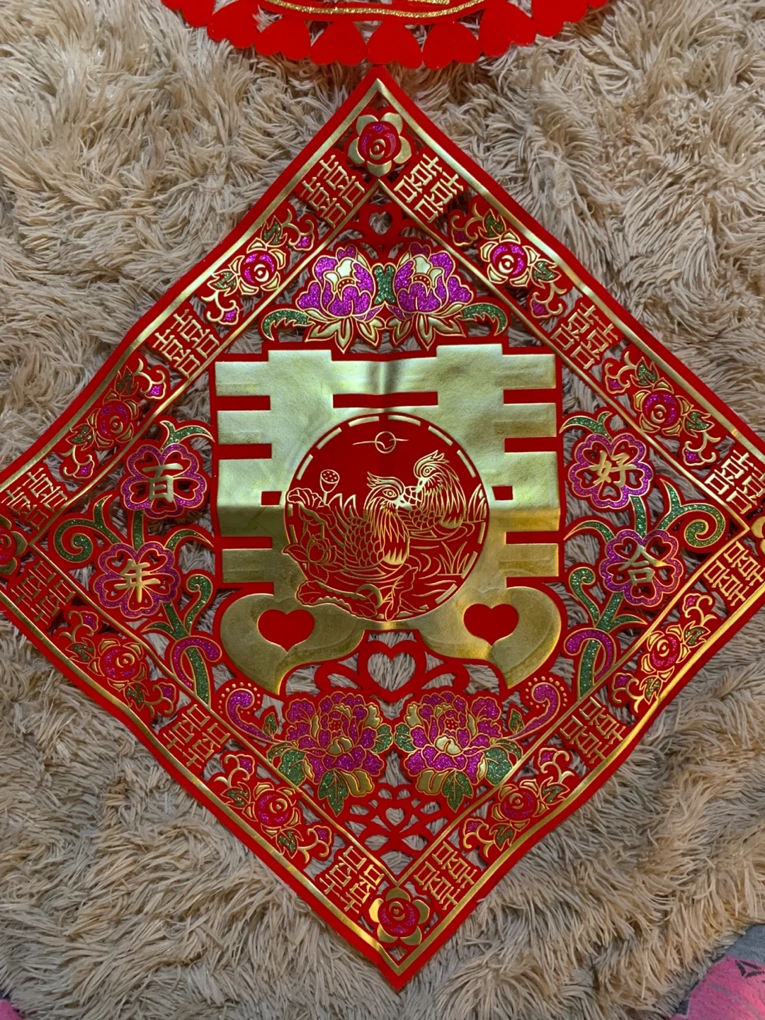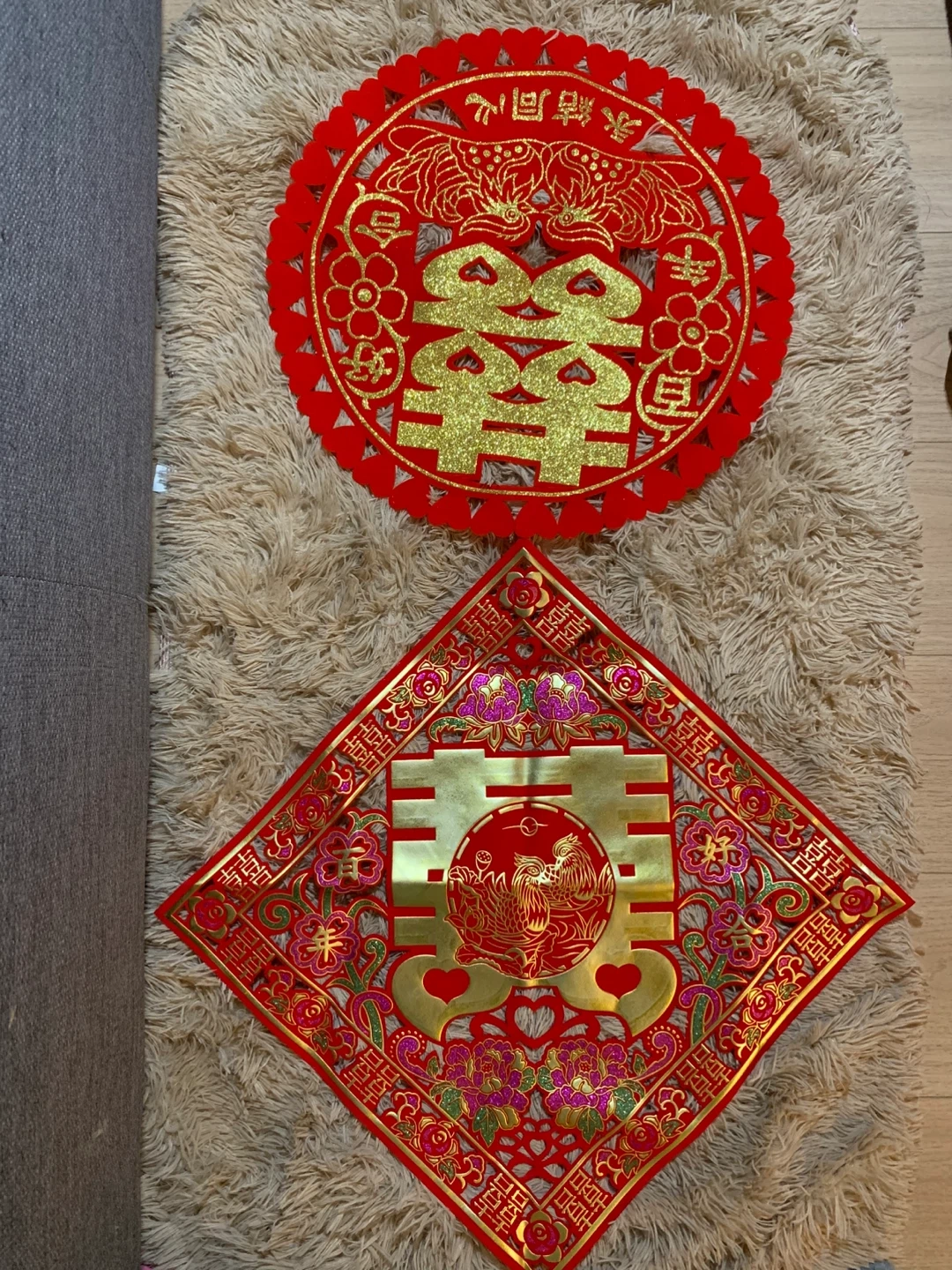 These are traditional Chinese wedding decorations in red and gold. Perfect for adding a festive touch to your celebration or pictures! It includes two wall decorations and a tablecloth.