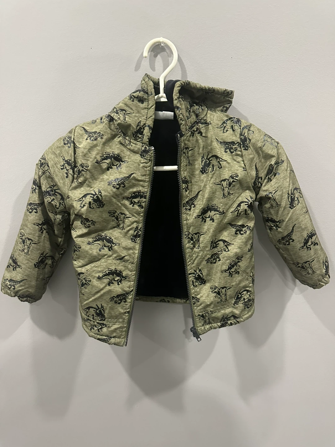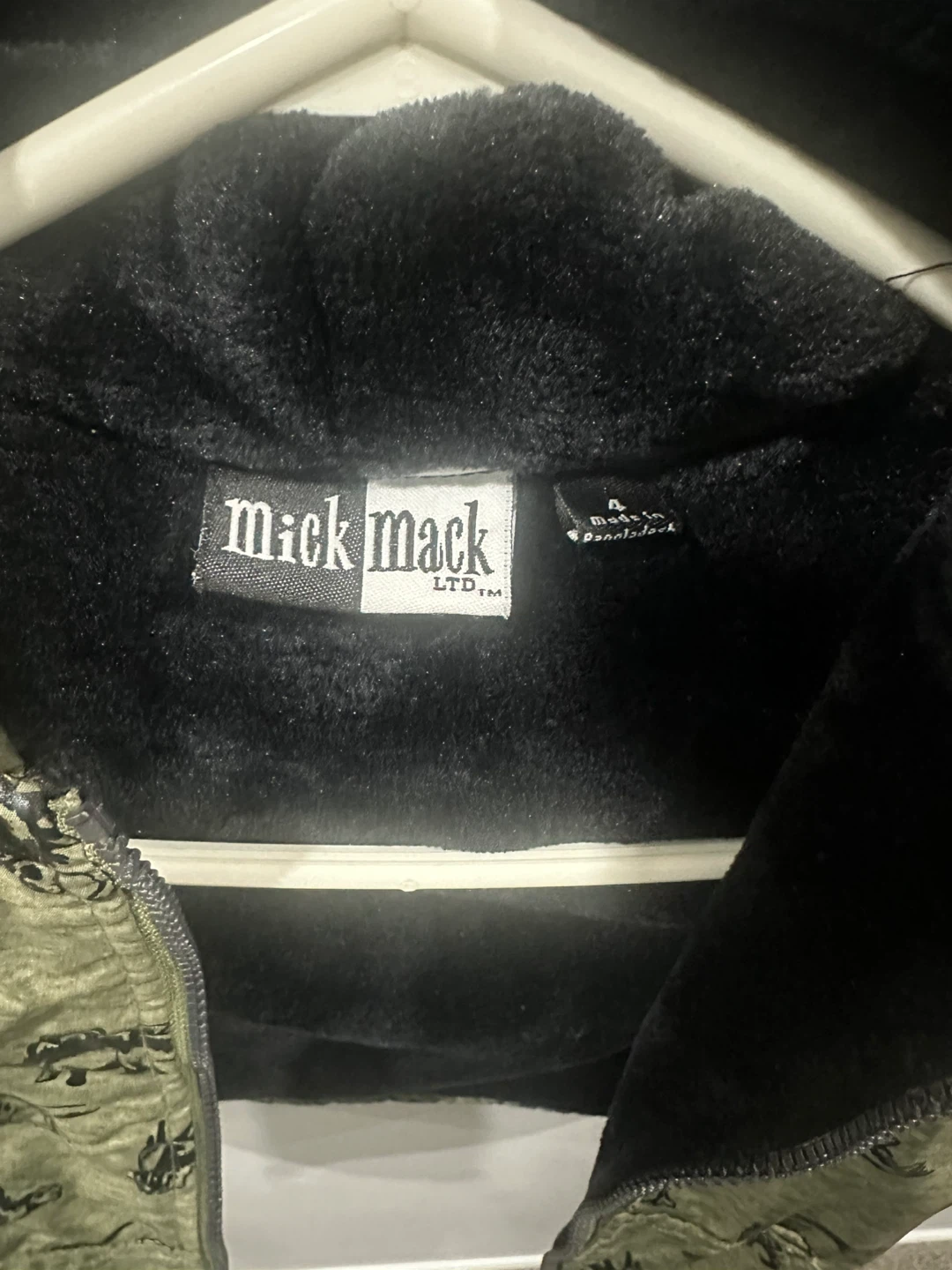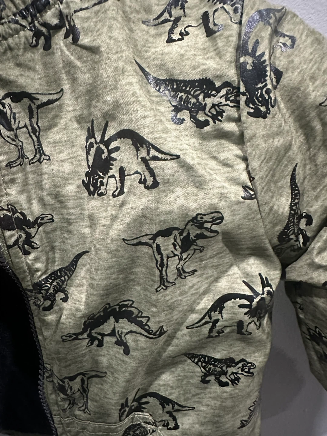 This Mick Mack jacket is a size 4 and features a fun dinosaur print. It's a great jacket for keeping your little one warm and cozy!
