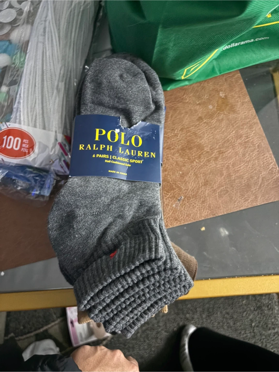 Selling a pack of Polo Ralph Lauren socks! This set includes 6 pairs of classic sport socks with half cushioned soles. They are grey in colour and made in China