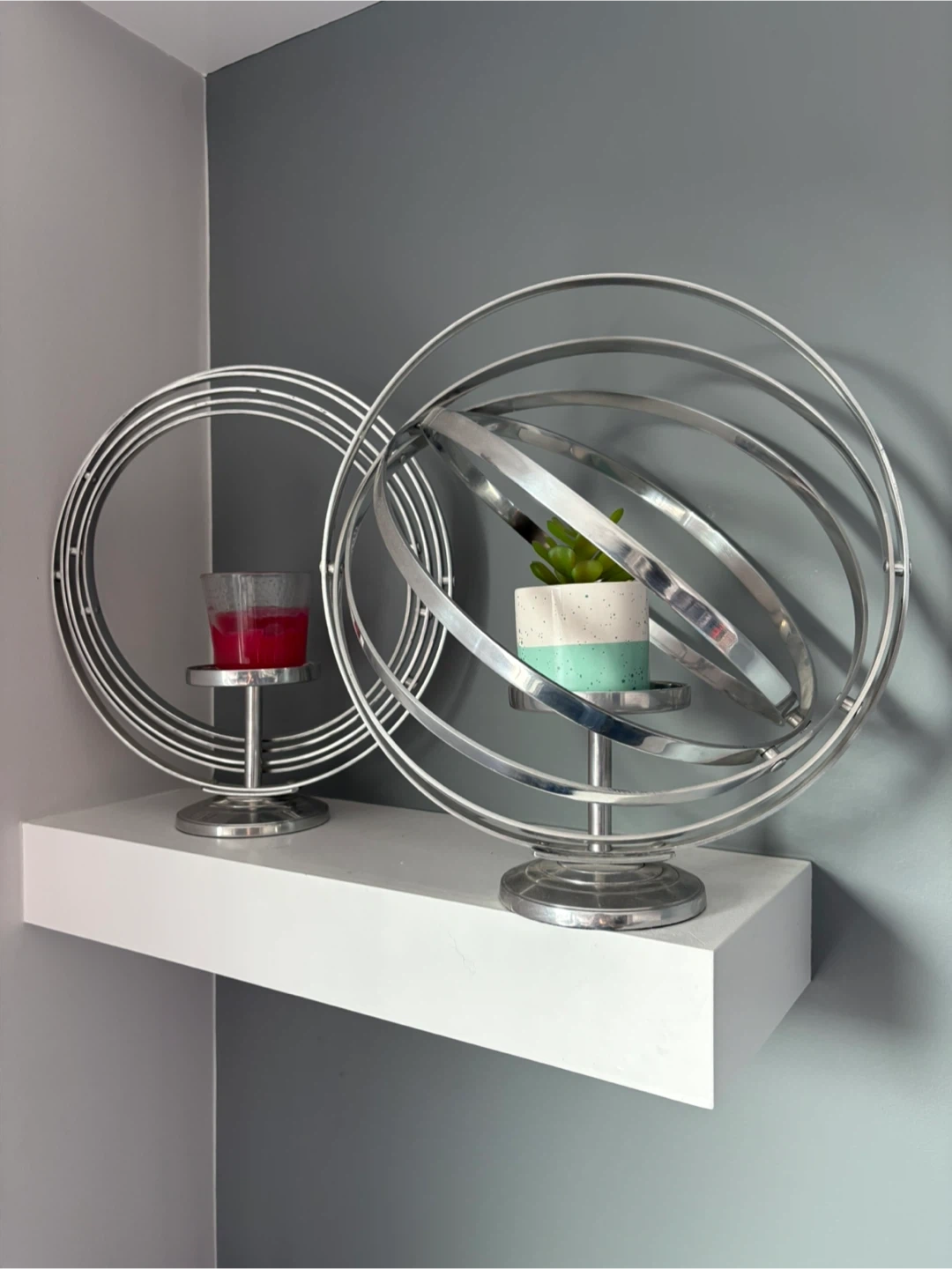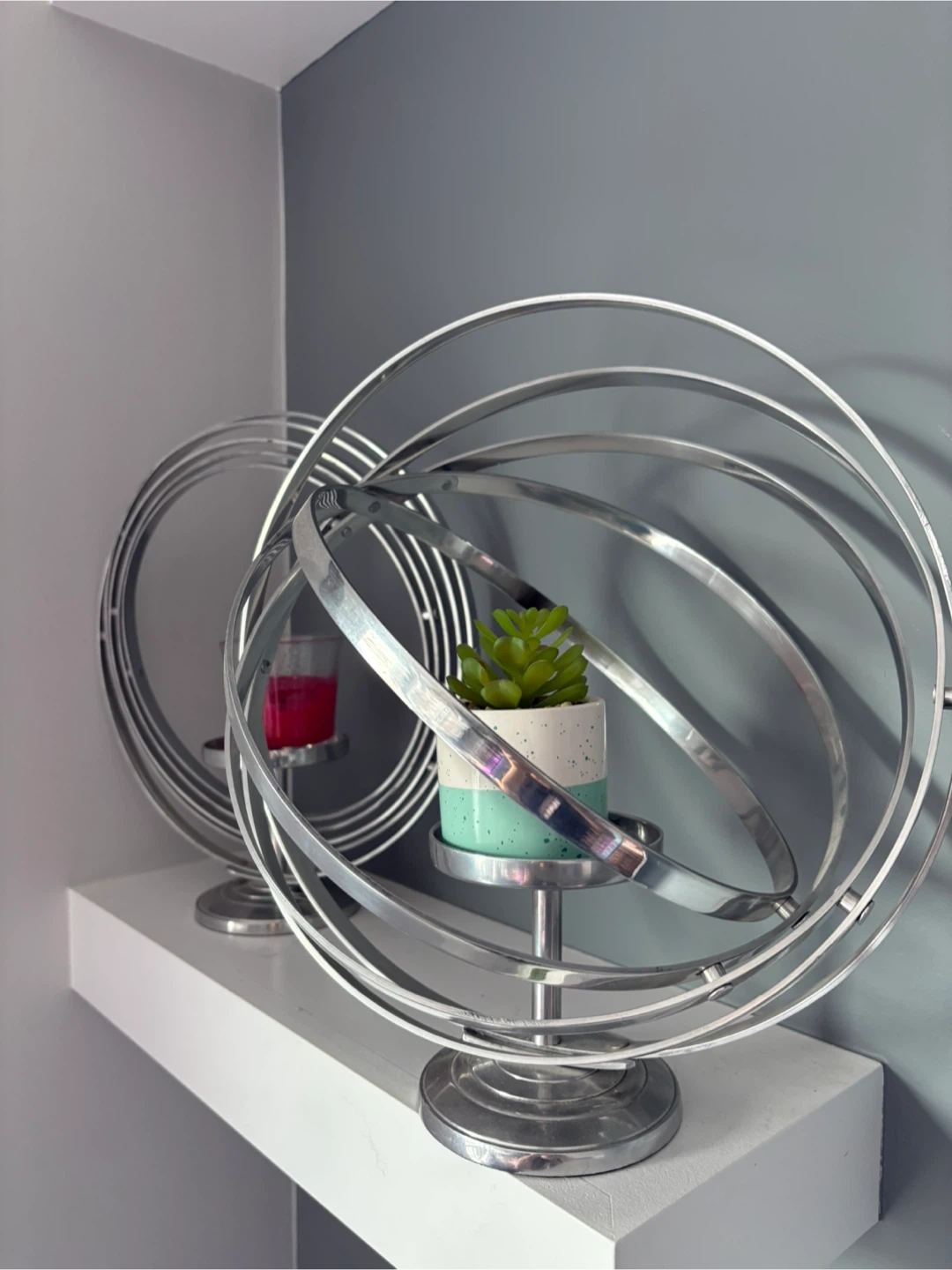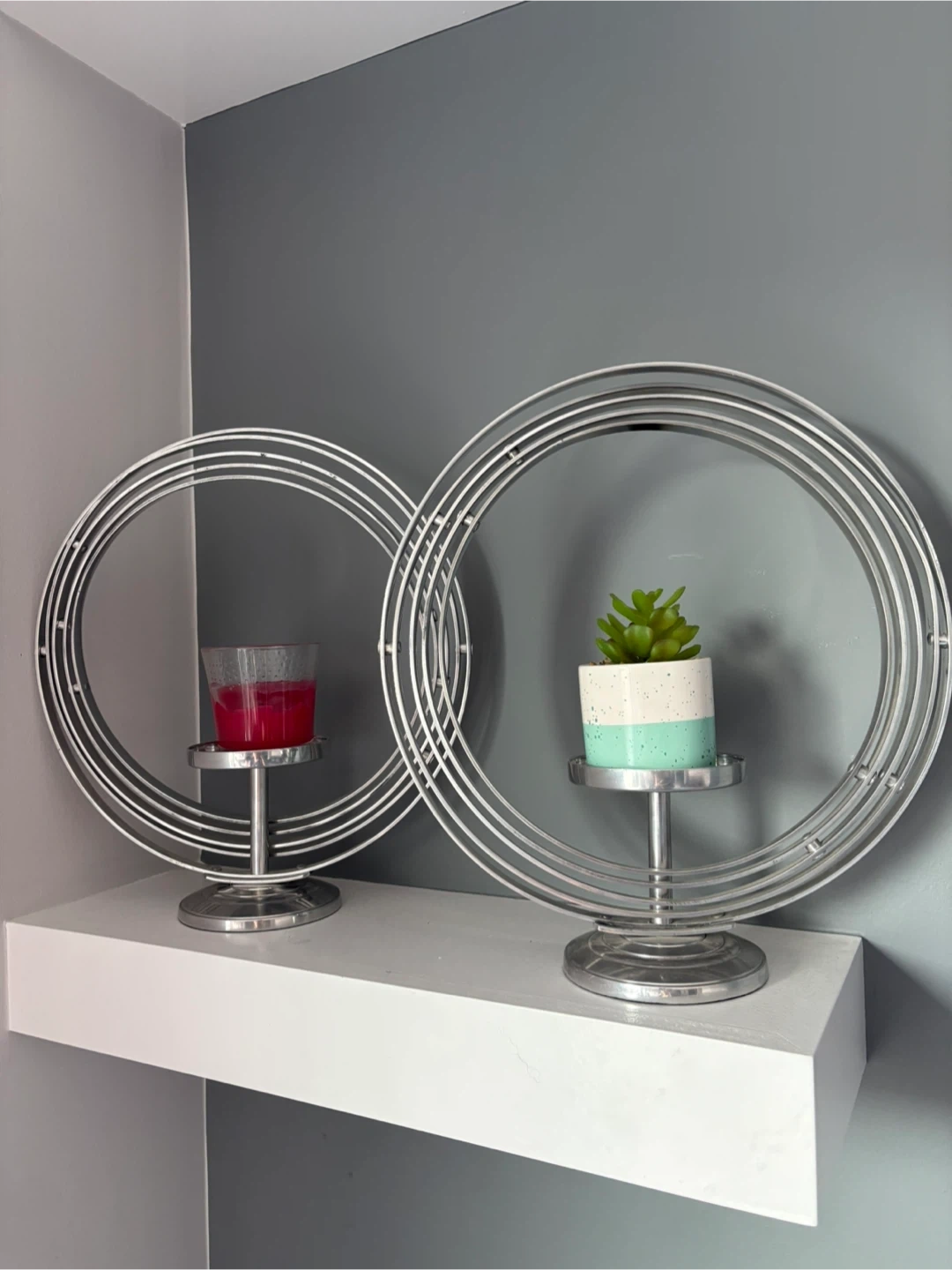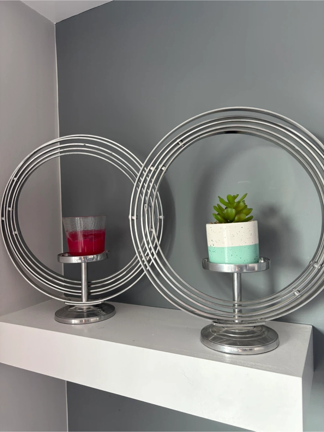 Selling a pair of unique silver metal holders! One is holding a candle, and the other is holding a small plant. They add a cool, modern touch to any room!