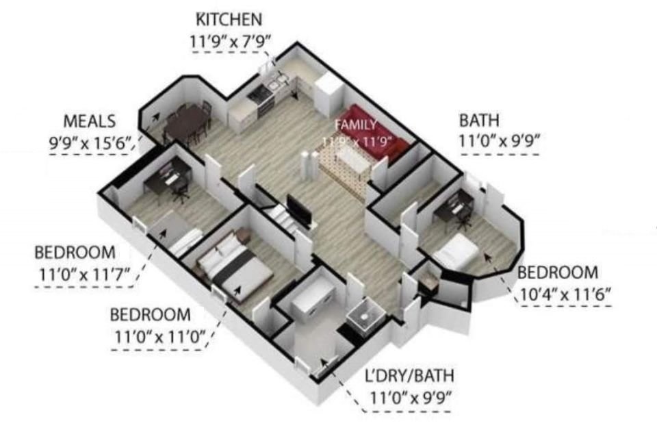 Three bedroom basement apartment. Recently renovated, with two washrooms (one with bath, one without). Private laundry. Two parkings included in base rent. One extra parking space potentially available at extra cost of $100/month/parking space.