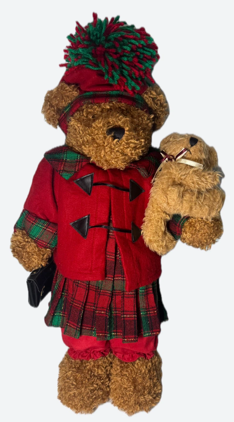 Ultra RARE Hard-2-Find!!! Dan Dee's Limited Edition Holiday Shopping Bears! Discover the cozy charm of the Dan Dee Teddy Bear Mom & Baby Bear plush set, a lovely addition to any collection or home. Made with care, these medium-sized bears reflect the quality and nostalgia that the Dan Dee brand is famous for. The soft, plush fabric is ideal for cuddling or showcasing, making them a fantastic gift for bear lovers of all ages. This set includes a caring mother bear with her cute baby, creating a heartwarming scene that’s bound to bring joy. Mother Bear is dressed in a cozy pom-pom hat made from soft yarn. She stands approximately 22 inches tall, while her baby bear companion measures about 8 inches. Momma Bear carries a black purse and wears a lightweight, fleece-like jacket finished with plaid-trimmed cuffs. Beneath the coat, she is dressed in a charming plaid dress. Whether you’re celebrating a special occasion or just expanding your collection of stuffed animals, this plush pair is a charming choice that’s sure to be treasured.