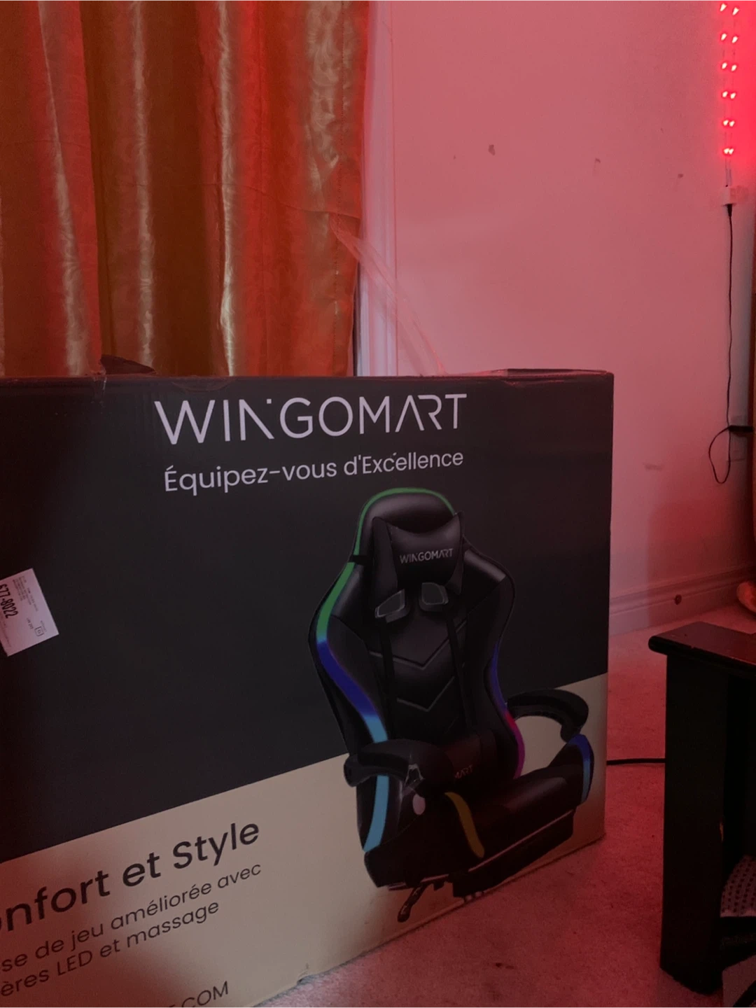 Selling a brand new WINGOMART gaming chair still in its original packaging! It's black with LED lighting and massage features. Get ready for comfort and style with this excellent gaming chair!