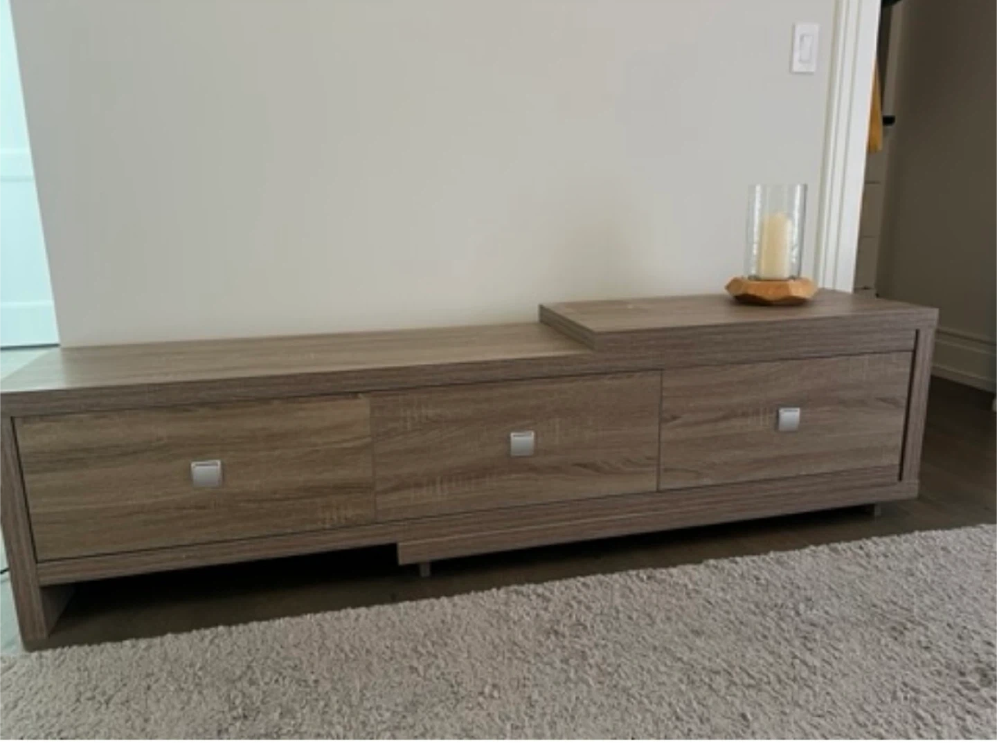 Selling a wooden TV stand with a light brown wood grain finish! It features three drawers with silver square handles. Great for living rooms or entertainment spaces!