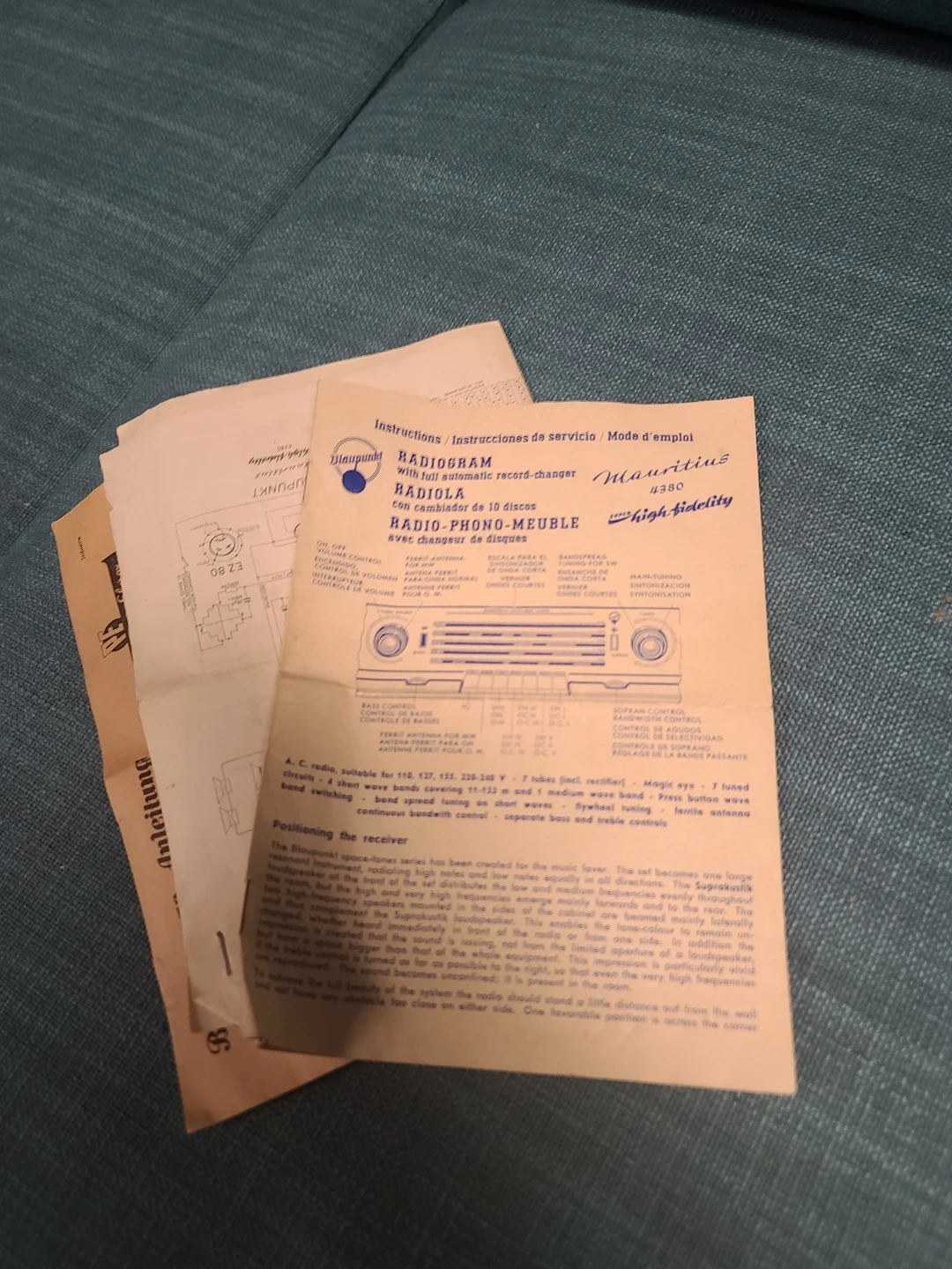 Here's a vintage Blaupunkt Radiogram Mauritius 4380 Radio/Grammaphone Meuble. It's a radio/storage unit with a record changer. The unit has a high fidelity sound system. It also comes with the original instructions and manuals. Some marking on top after years of storage. Belt on record player could use a change. Mirrored cabinet with upholstered back adds to the antique appeal.