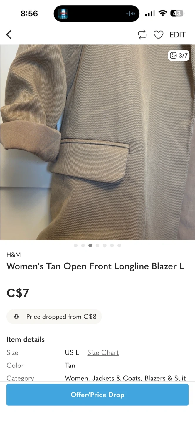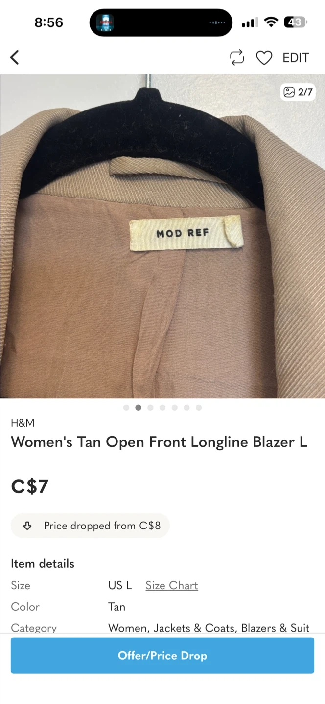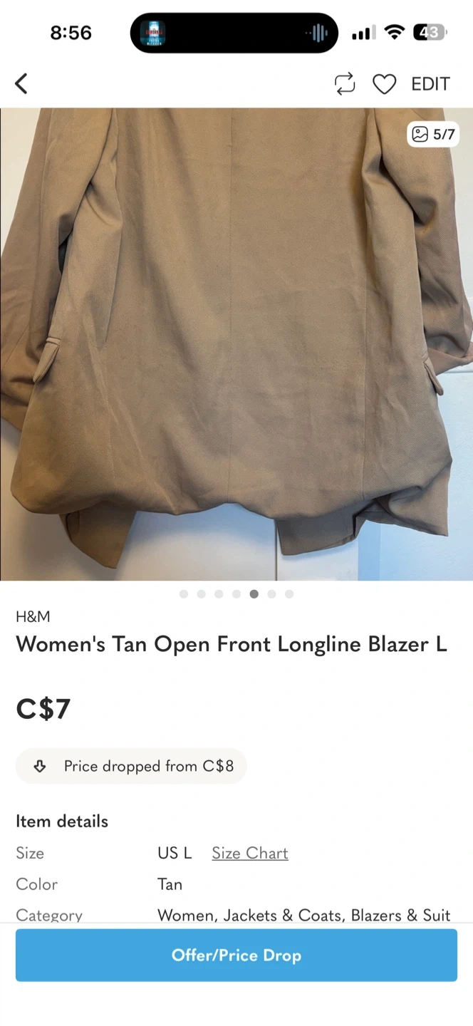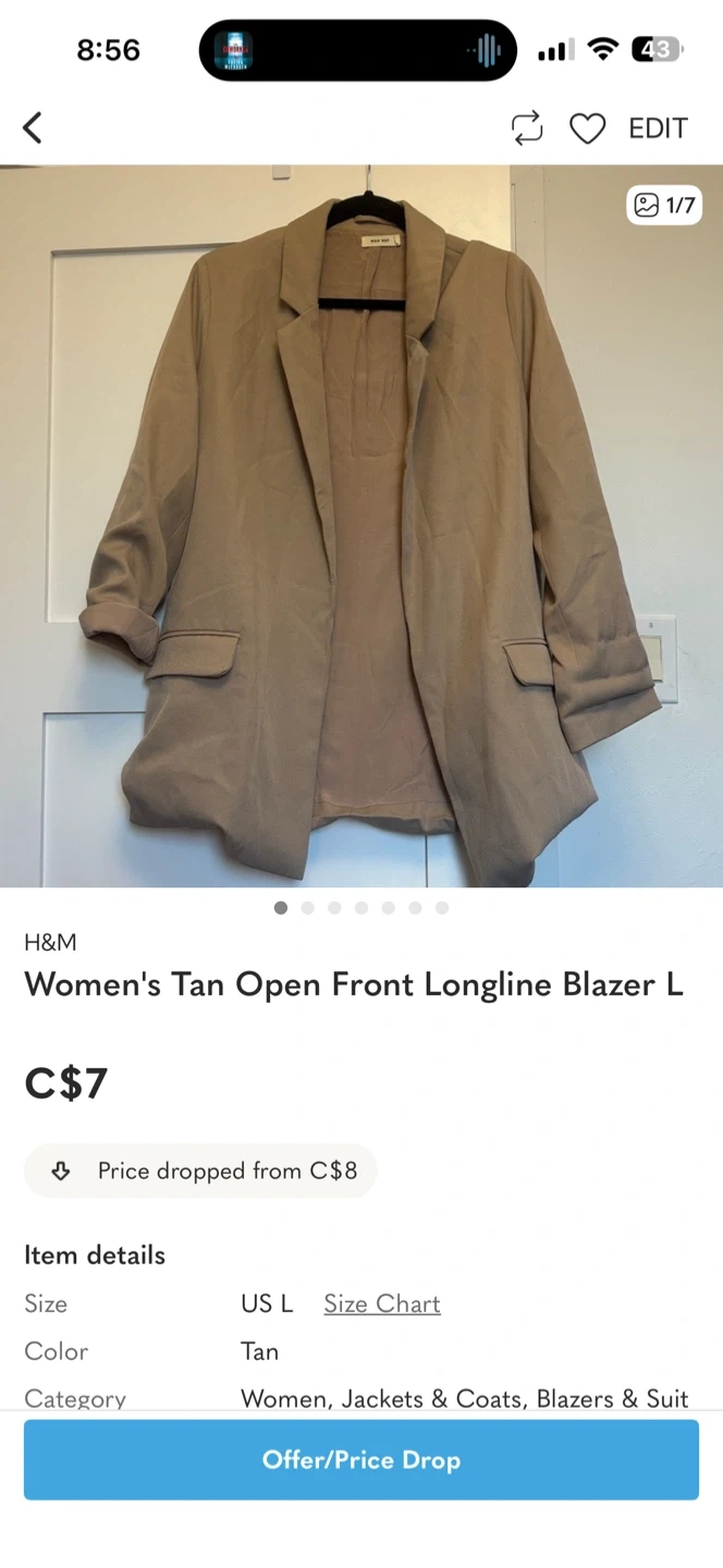 FREE women's blazer in a tan colour. It's a size large and has an open front, longline style.