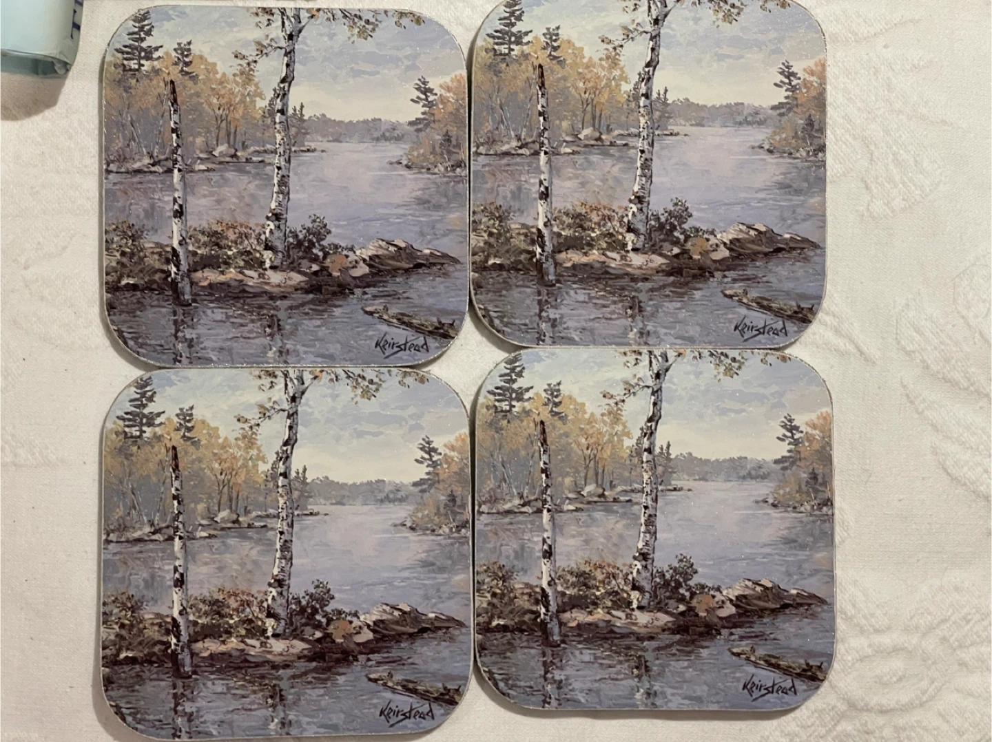Selling a set of Keirstead Classics coasters with a beautiful artistic tabletop accent design! These coasters come with their original box, adding a touch of elegance to your home decor. Perfect for protecting your furniture while showcasing a classic Canadian art piece